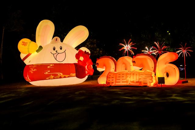 课植园打谷场上,萌趣“兔小布”手持葫芦造型宫灯,将“福禄临门”的传统祈愿化作灵动景致。这座高达5.5米的巨型灯组既凭借萌趣造型延续了“上海发布”专属IP的高亲和力与强辨识度,又巧妙融入马年新春雅韵,让传统与新潮碰撞出独特火花;围巾纹样中,古镇标志性建筑放生桥与石榴花交相辉映,以细腻笔触勾勒出“角里”独特的水乡肌理,让传统年味与古镇气质完美交融。