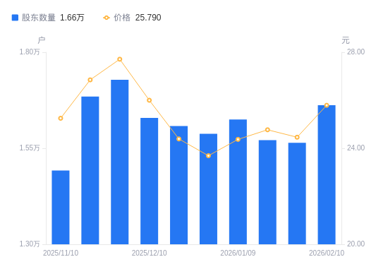 日期A股户数(户)流通A股户均持股数(股)户均持股市值(万元)2026-02-10166204680.4712.072026-01-30156424952.3312.112026-01-20157104930.9012.212026-01-09162474767.9211.622025-12-31158754879.6511.562025-12-19160774818.3411.752025-12-10162904755.3312.362025-11-28172824482.3712.422025-11-20168474598.1112.352025-11-10149195192.3313.11