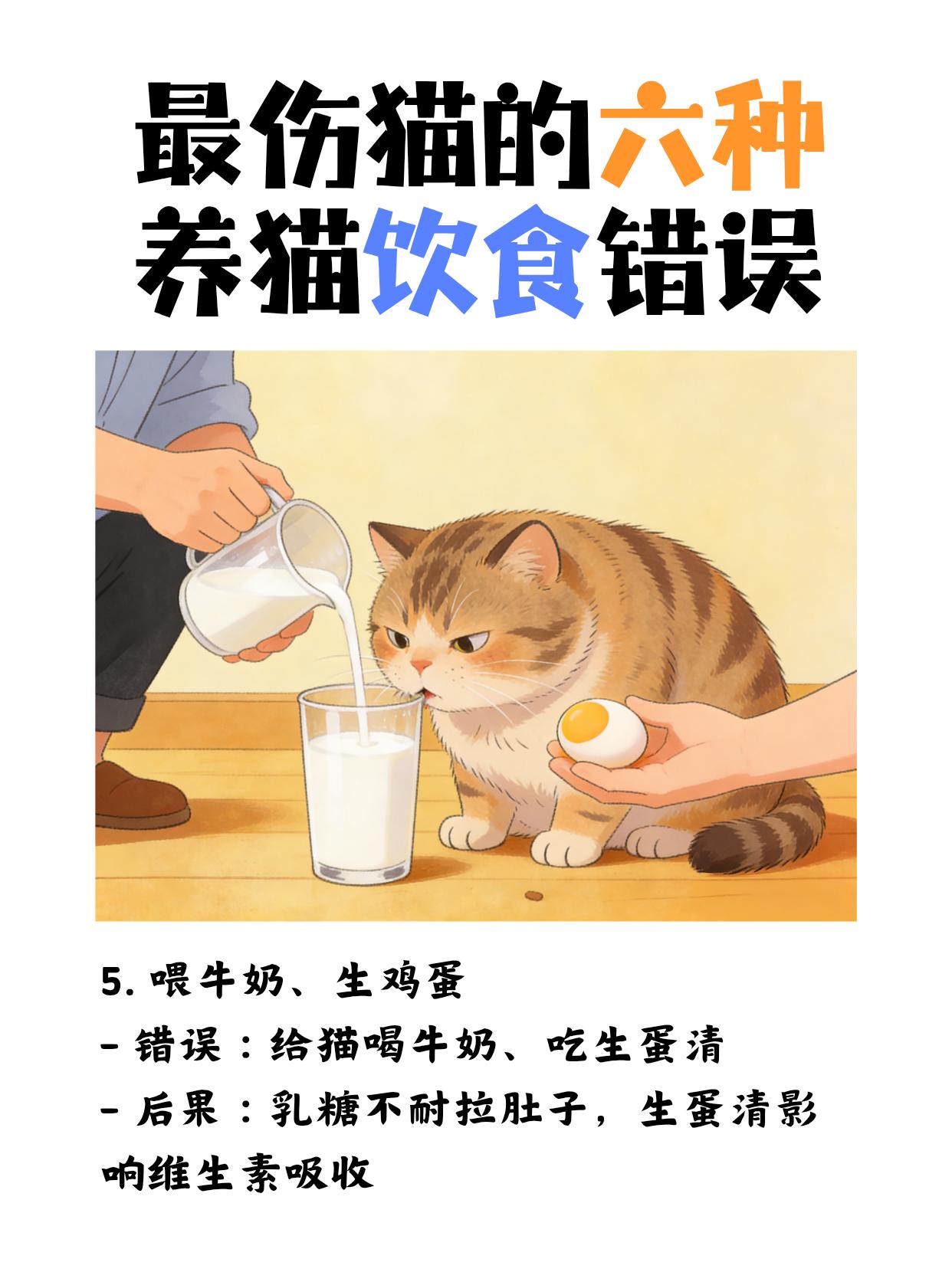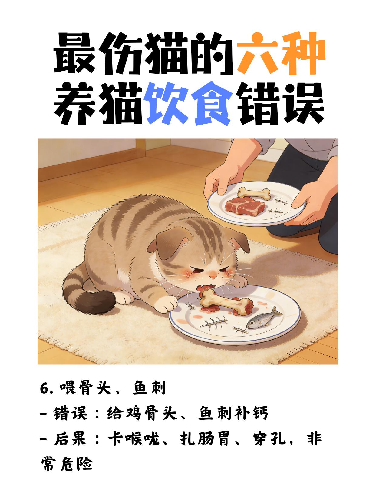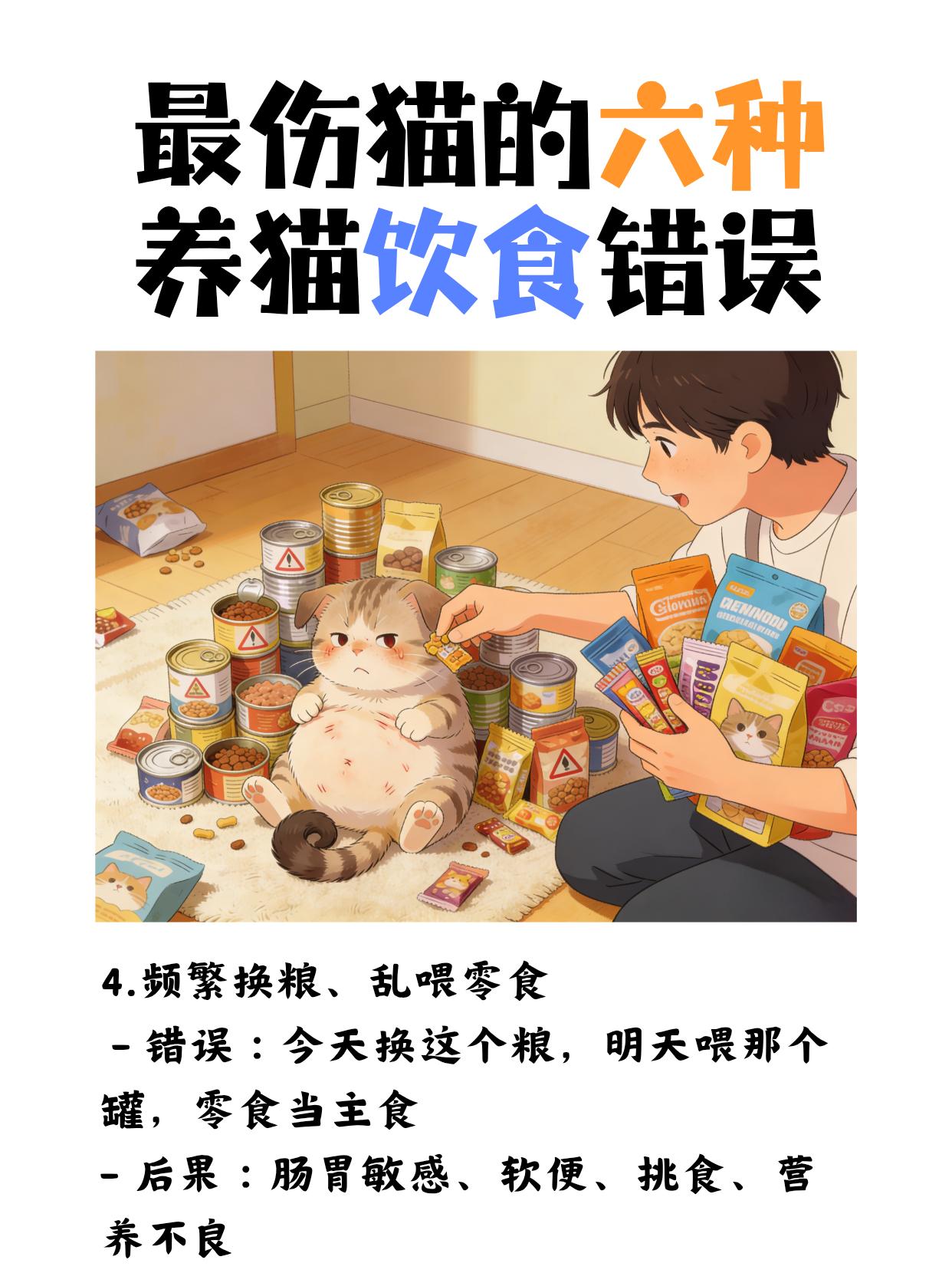 最伤猫的六种养猫饮食错误 1. 喂太多、无限自助 - 错误:猫粮碗永远满着,猫想吃就吃 - 后果:肥胖、糖尿病、胰腺炎、心脏负担重 2. 给猫吃人吃的饭菜 - 错误:喂剩菜、火腿肠、肉汁、咸零食 - 后果:盐、油、调料伤肾,洋葱、葱蒜直接中毒 3. 只喂干猫粮,不喝水 - 错误:全吃干粮,又不爱喝水 - 后果:尿闭、肾结石、肾衰竭(公猫尤其危险) 4. 频繁换粮、乱喂零食 - 错误:今天换这个粮,明天喂那个罐,零食当主食 - 后果:肠胃敏感、软便、挑食、营养不良 5. 喂牛奶、生鸡蛋 - 错误:给猫喝牛奶、吃生蛋清 - 后果:乳糖不耐拉肚子,生蛋清影响维生素吸收 6. 喂骨头、鱼刺 - 错误:给鸡骨头、鱼刺补钙 - 后果:卡喉咙、扎肠胃、穿孔,非常危险