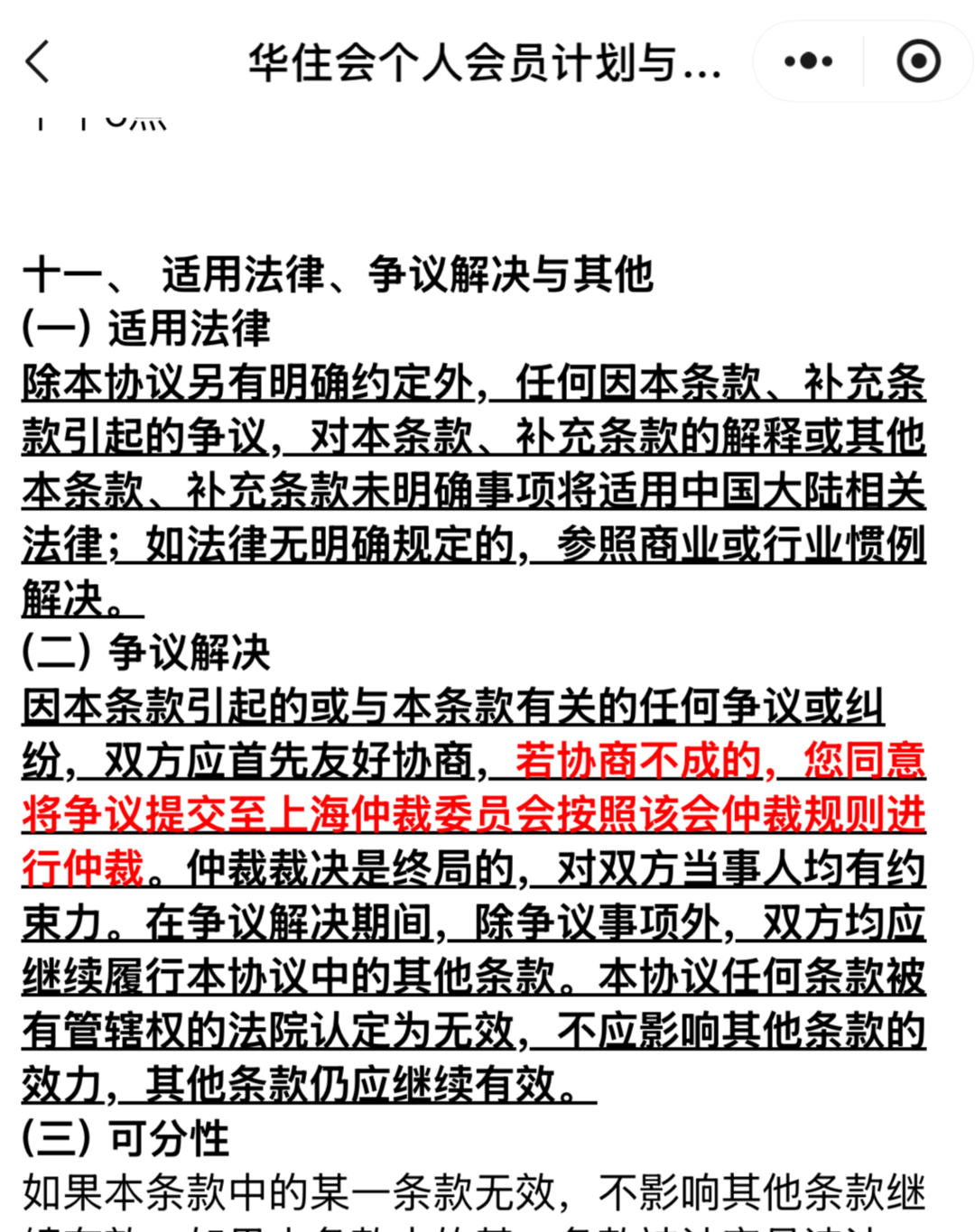 在北京市场监管局发布的通报中提到,华住会2025年7月18日正式生效的《华住会个人会员计划与服务条款》第十一条第(二)项内容“若协商不成的,您同意将争议提交至上海仲裁委员会按照该会仲裁规则进行仲裁”,存在利用格式条款不合理限制消费者主要权利的问题,涉嫌侵害消费者合法权益。《华住会个人会员计划与服务条款》单方面限定争议只能通过上海仲裁委员会仲裁解决,剥夺了消费者依据《中华人民共和国民事诉讼法》向人民法院提起诉讼的权利。通过格式条款“强制绑定”上海仲裁委员会为特定仲裁机构,限制了消费者的维权途径,加重消费者责任。