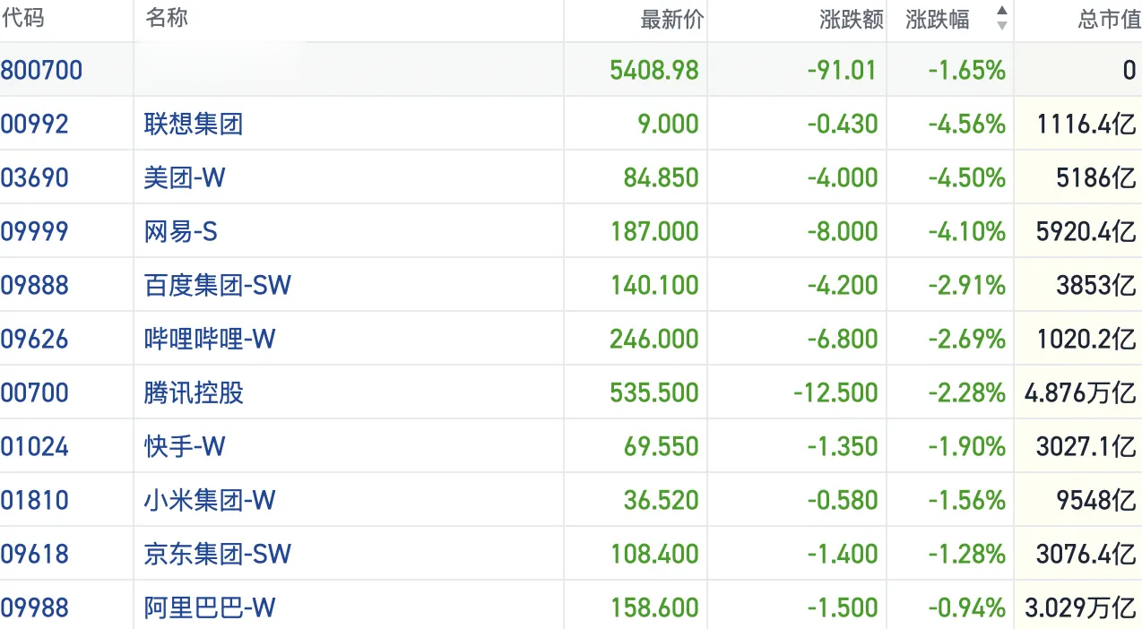 盘面上,今日大型科网股行情急转向下,拖累市场情绪。美团跌4.5%,百度跌近3%,腾讯、小米、京东、阿里巴巴皆有跌幅。
