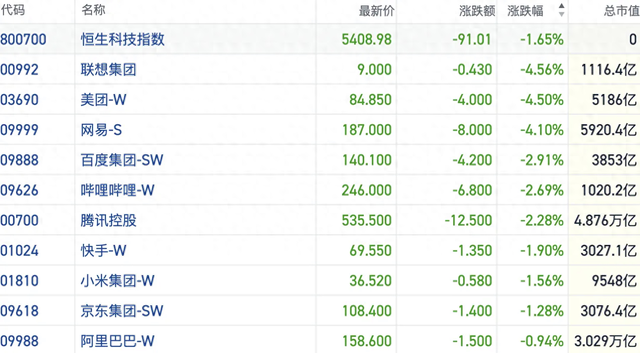 盘面上,今日大型科网股行情急转向下,拖累市场情绪。美团跌4.5%,百度跌近3%,腾讯、小米、京东、阿里巴巴皆有跌幅。