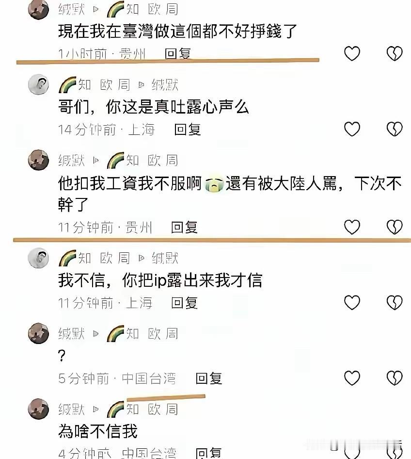 一直怀疑那些无脑举报抗战纪实类电影、电视剧的都是对岸派来水军,没想到不止是日本有大批潜伏人员盯着我们的影视文化产品,台湾更是有很多不太聪明的水军因为完不成任务被扣工资。 这些绿蛙除了会造谣,就剩下在评论区带节奏了,关键是他们大多数不会使用简体字,大陆网友一看到是繁体字,自然就提前警觉了,这就是所谓的一眼假。 他们想搞渗透工作,改变IP只是第一步,后面还要学会简体字和普通话这些最基本的,另外还有很多风俗、文化符号等等,可能是他们一辈也学不会的。 干什么不好,非要搞分裂,被扣工资还挨骂,也是没谁了。 不过对于日本潜伏的水军,总是在一些评论区大肆使用举报的权利,比如《731》上映的时候,那是多少人齐上阵。 还是他们舍得花钱,请的水军还真难被发现,装的比我们中国人更像中国人,无论是语言还是文字。 你们有没有什么好办法抓住这些日本潜伏在国内网络的水军?