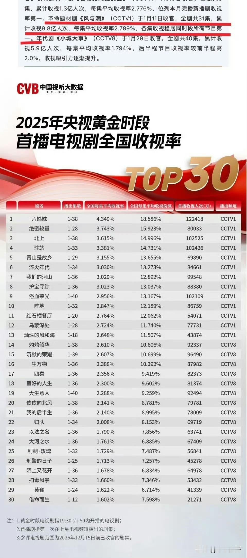 风与潮太厉害👍, 累计9.8亿人次观看, 收视集均人次3161万, 各集收视稳