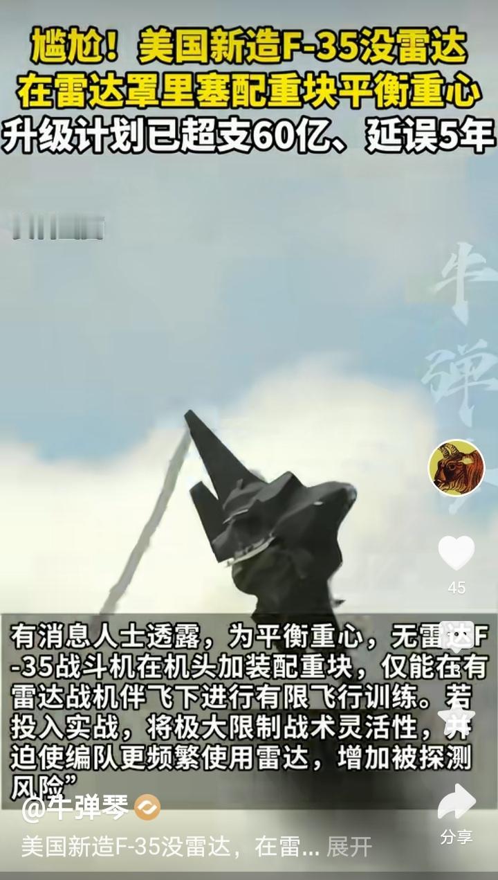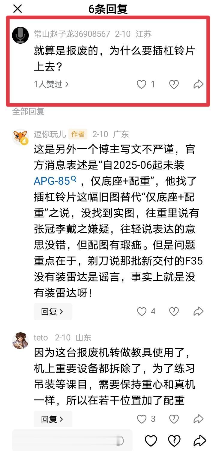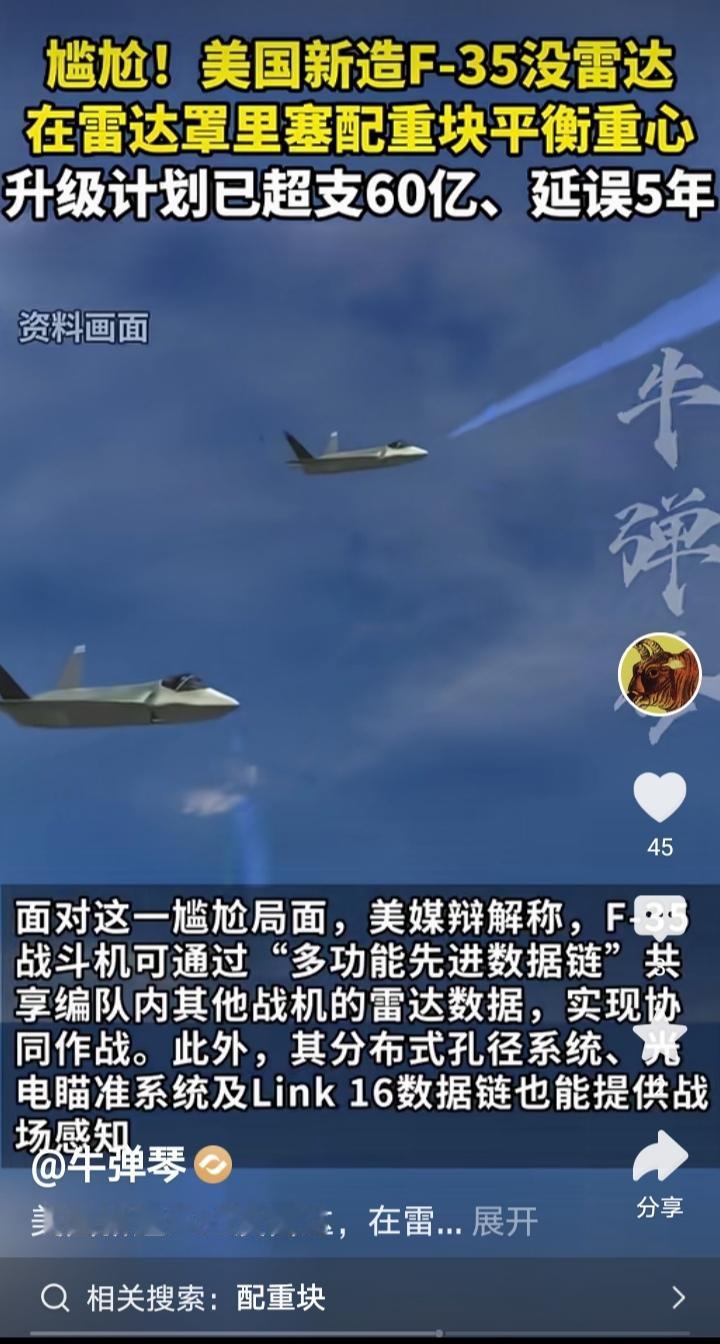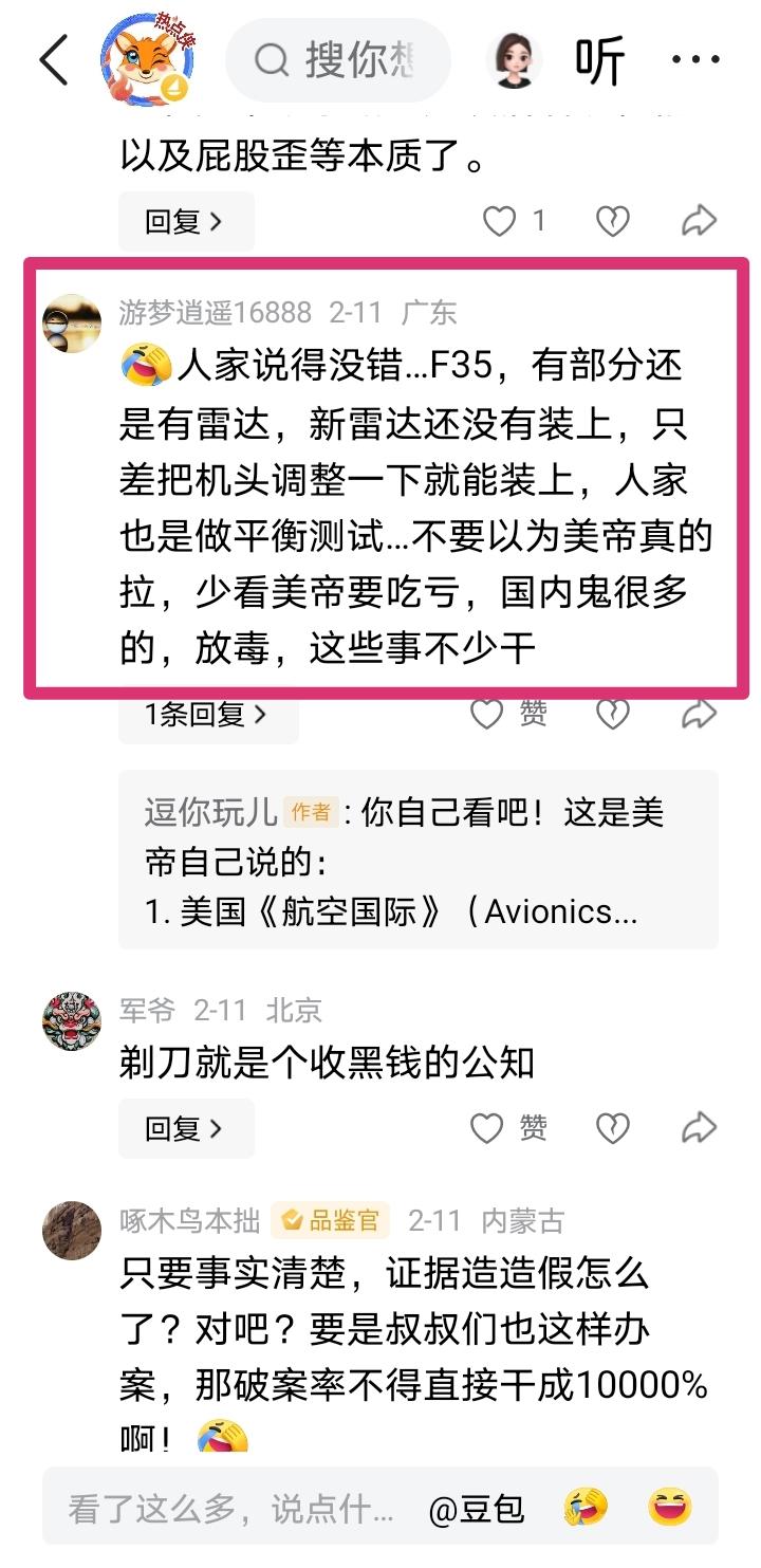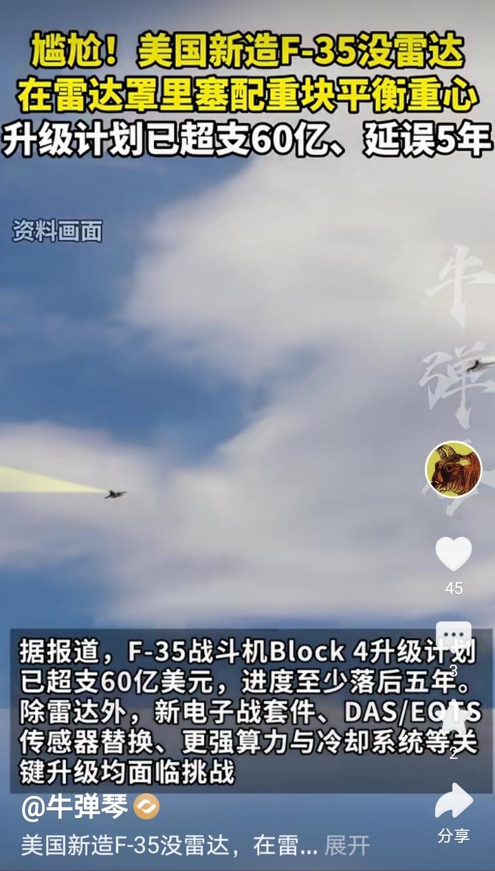 那些在我10号那篇贴文评论区站队某剃刀,认为F35新机没有安装雷达是谣言的网友,看看今天新华社马甲牛弹琴的报道吧! 看看它援引的消息是哪里的,够不够权威?想了解清楚点,可以好好看看附图一、二、三、四里面的文字,四张连一起里面写的明明白白了! 所以不要迷信那些所谓的大V或者号称当了几十年科普专家,在电子通讯领域教学二十载的某某某。 我在这里想说的并不是否认他们的专业知识,而是想说他们有时写文章太草率了,没有认真去查证,仅凭自己的经验就轻易下结论说别人造谣。对反驳他们的网友,不顾事实动辄反唇相讥,说人家智商低等等。但凡有网友夸祖国的科技进步,就说这是自嗨,仿佛只有说大洋彼岸永远领先咱们才是正确的,现在这类专家教授在网络上可不少哇! 我想他们缺的不是专业知识,而是应该补补钙了,膝盖太软站不起来,视线太低影响了正确判断。