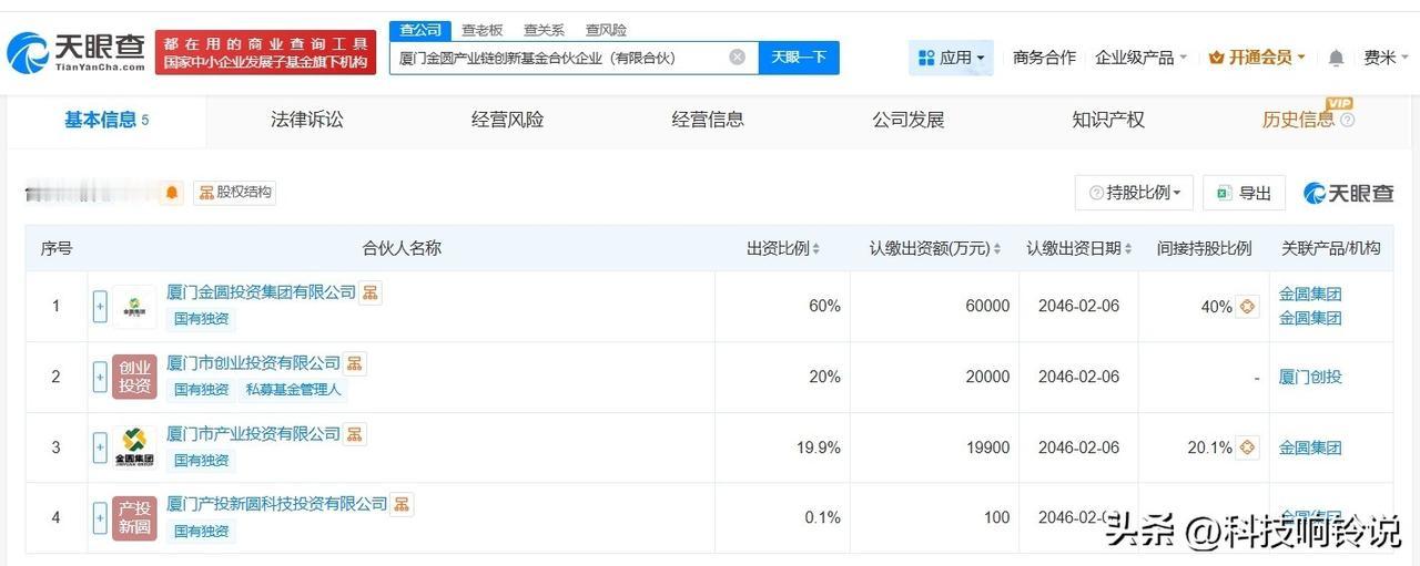 【厦门金圆产业链创新基金登记成立 出资额10亿】 天眼查App显示,近日,厦门金圆产业链创新基金合伙企业(有限合伙)成立,执行事务合伙人为厦门市创业投资有限公司,出资额10亿人民币,经营范围为以私募基金从事股权投资、投资管理、资产管理等活动,由厦门金圆投资集团有限公司、厦门市创业投资有限公司、厦门市产业投资有限公司、厦门产投新圆科技投资有限公司共同出资。 天眼查信息: