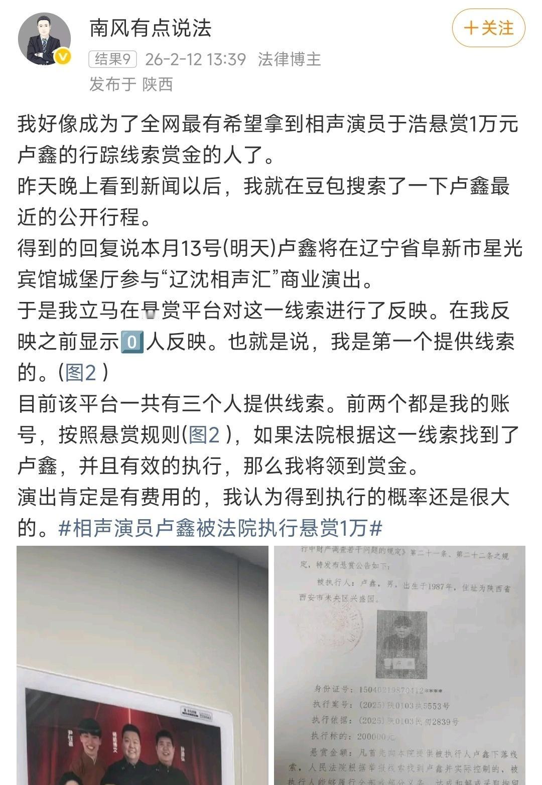 相声圈这波大瓜完全是离谱到家了。 相声演员卢鑫被西安法院悬赏1万找下落,申请人还是老搭档张玉浩。 看着像躲债失联了。 当年俩人凭《笑傲江湖》夺冠,创办相声新势力火遍全网,是实打实的黄金搭档。 后来突然就闹出债务纠纷,现在突然卢鑫就失联了。 有律师已经爆出他2月13日会在辽宁阜新参加商演,就看法院这次能不能逮到他了。 曾经并肩打拼的好兄弟,因为一场官司闹到悬赏找人的地步,看着太揪心了。 我的印象中,卢鑫人品一直没问题,绝对不是故意为之。 只求赶紧解开误会,别让当年的相声新势力,毁在一场乌龙里啊!