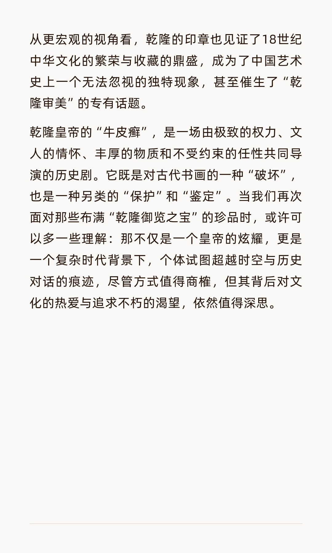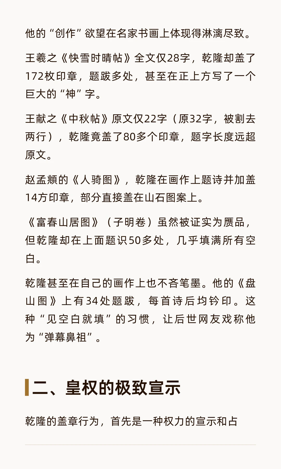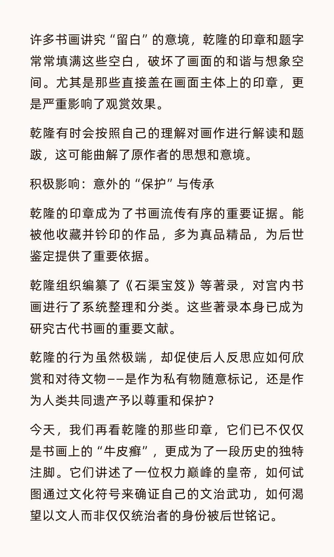 乾隆皇帝痴迷在书画上盖章题跋,留下密密麻麻的印记,既破坏了艺术品美感,也为后世鉴定提供了重要依据。他的行为反映了权力宣示与文化认同,成为18世纪中国艺术史的独特现象。