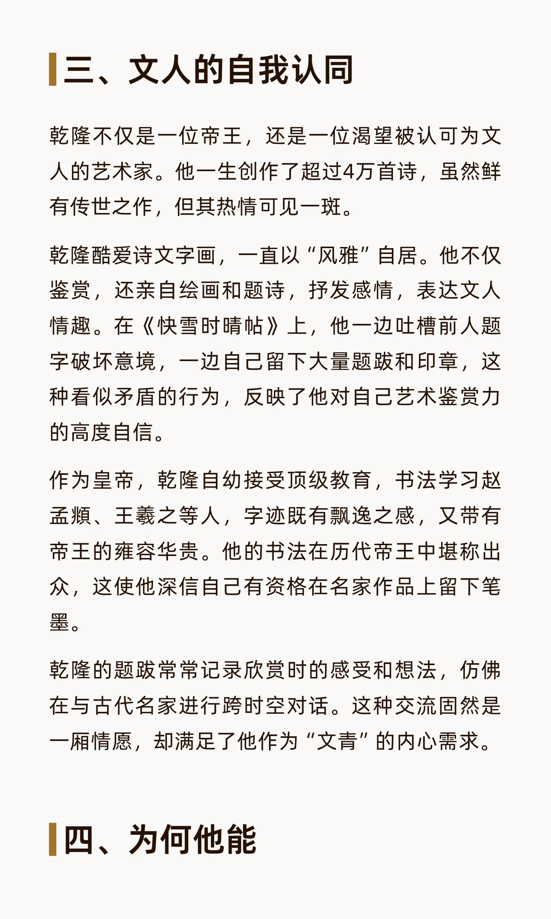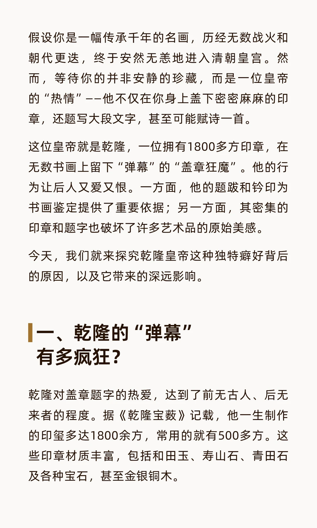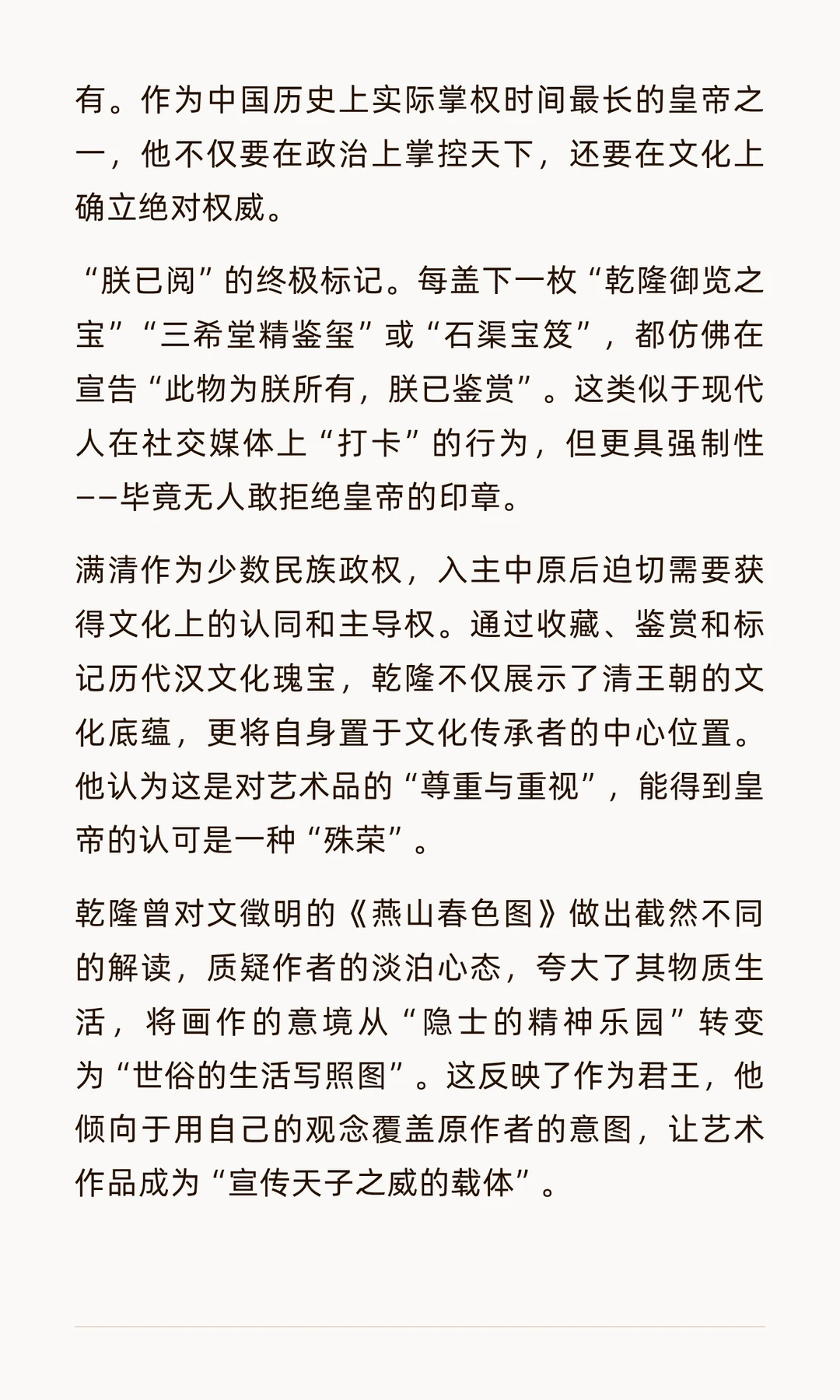 乾隆皇帝痴迷在书画上盖章题跋,留下密密麻麻的印记,既破坏了艺术品美感,也为后世鉴定提供了重要依据。他的行为反映了权力宣示与文化认同,成为18世纪中国艺术史的独特现象。