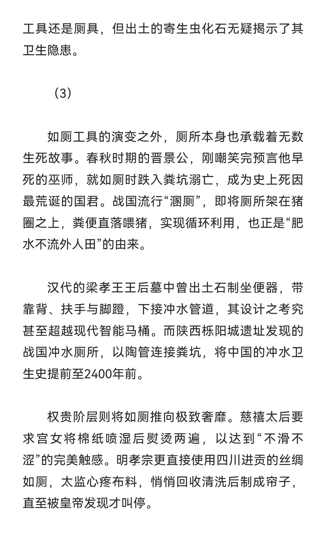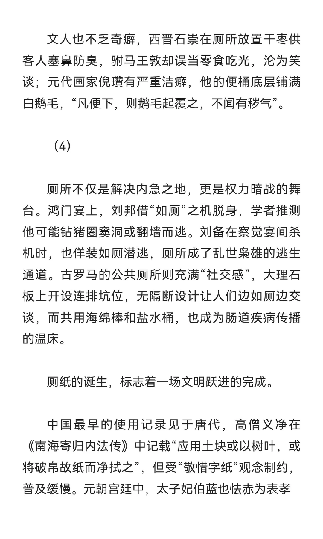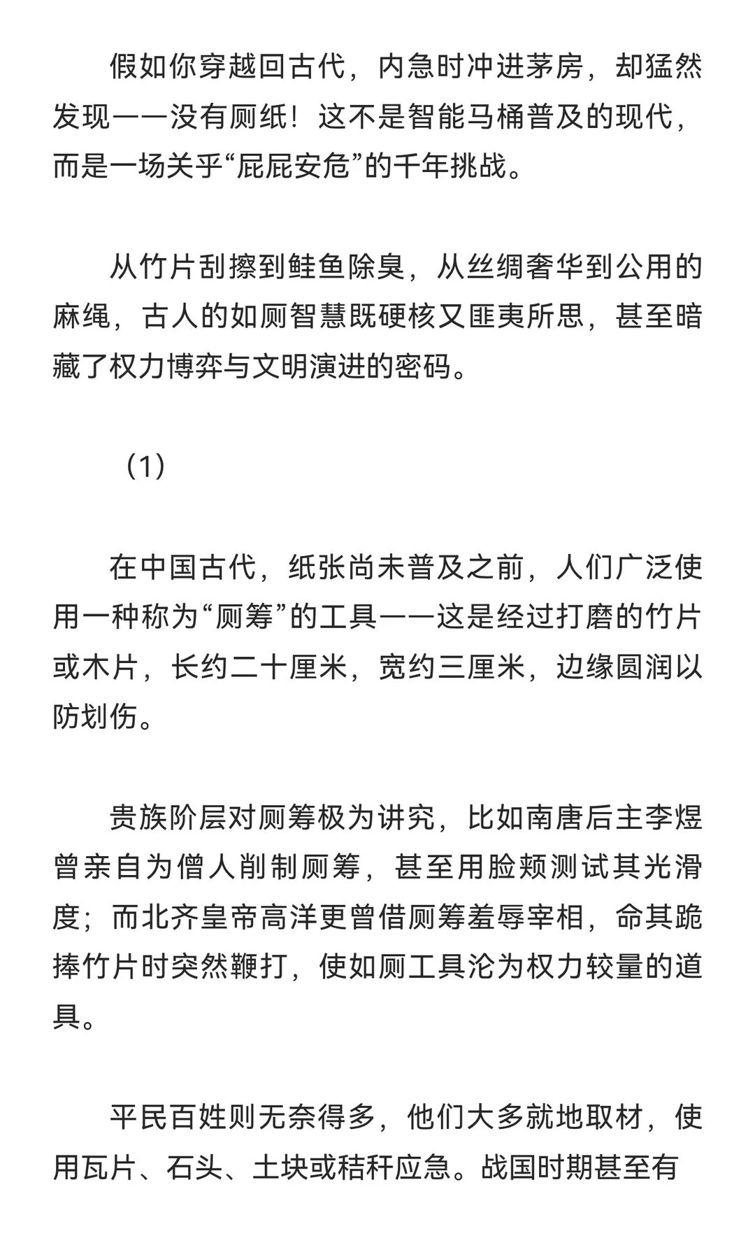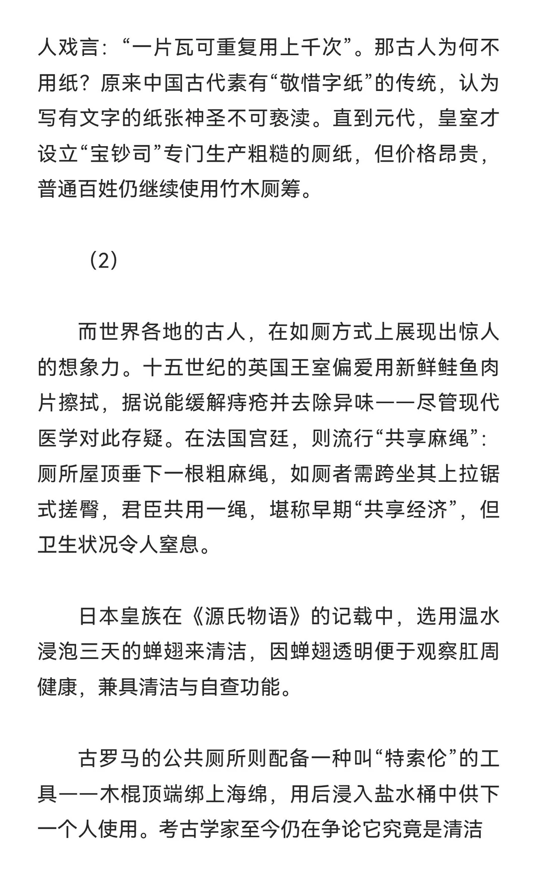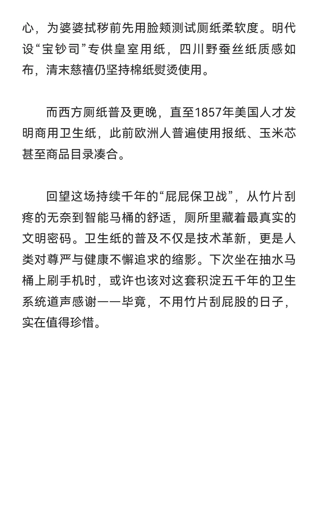 古代如厕工具从竹片到鲑鱼肉片,再到丝绸和麻绳,展现了不同文明的智慧与无奈。厕纸的普及标志着文明跃进,从竹片刮疼到智能马桶的舒适,卫生纸的诞生是人类对尊严与健康的不懈追求。