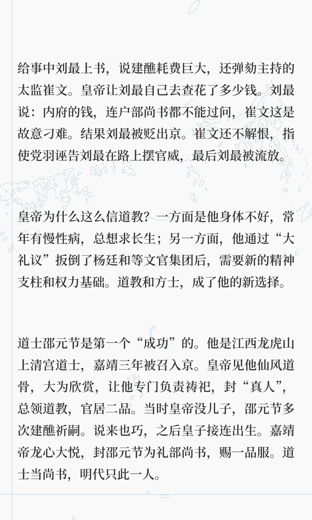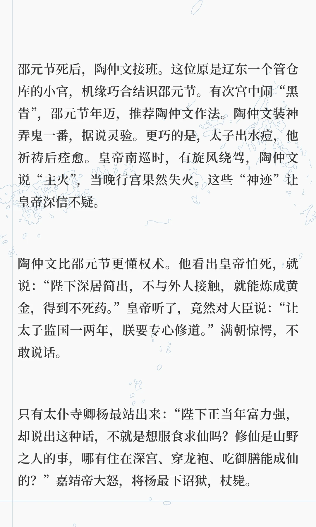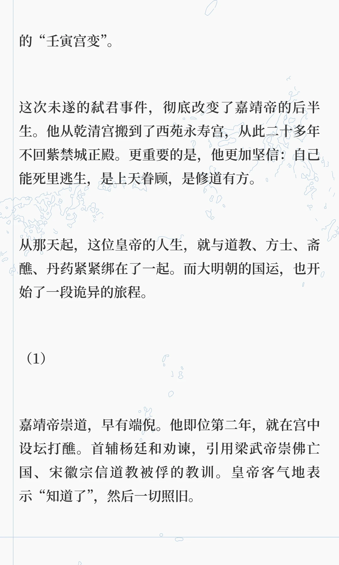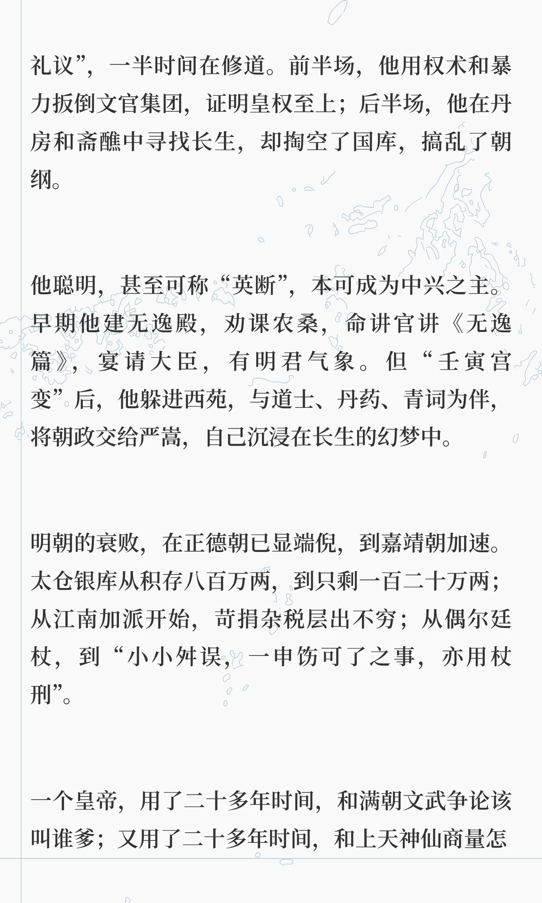 嘉靖帝痴迷道教,修道二十多年,耗尽国库,导致明朝衰败。他通过方士和斋醮寻求长生,却忽视朝政,最终将权力交给严嵩,导致朝纲混乱。