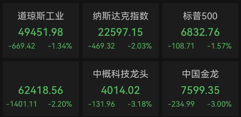 隔夜美股市场,三大指数全线大跌,道指一度大跌超700点,纳指大跌超2%,大型科技股集体重挫,VIX恐慌指数大幅飙涨超18%。