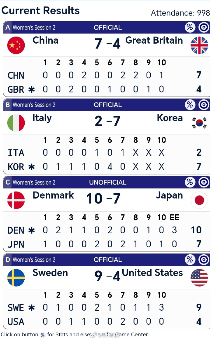 虎扑02月13日讯米兰冬奥会冰壶女子循环赛第二轮,四场比赛具体战况: