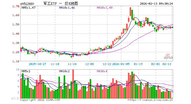 2月13日,军工ETF(512660)开盘跌0.27%,报1.474元。军工ETF(512660)重仓股方面,中国船舶开盘跌0.44%,光启技术涨0.00%,航天电子涨0.00%,中国卫星跌0.34%,航发动力跌0.17%,中航沈飞涨0.07%,中航光电涨0.06%,航天发展跌0.99%,菲利华跌1.00%,睿创微纳涨0.00%。