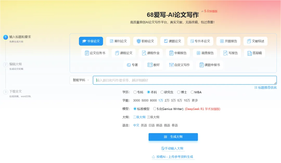 第二,68爱写AI的一键生成论文也很霸道。你只需要输入论文题目和基本要求,不到10分钟就能得到一篇万字论文初稿。无论是课程论文、毕业论文,还是期刊论文,质量都特别高。
