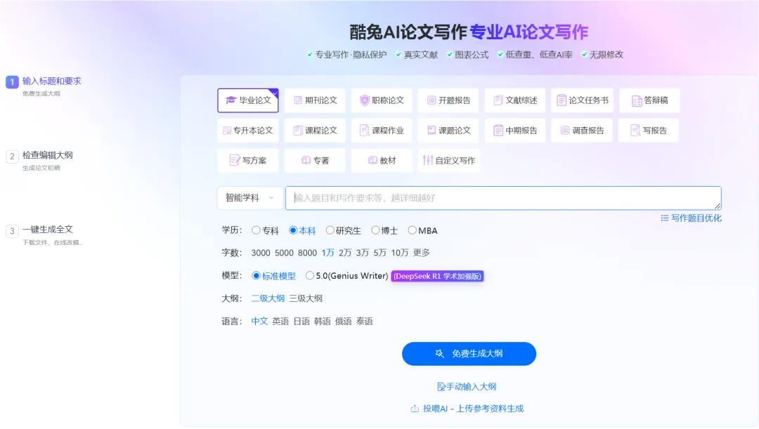 酷兔AI这个AI论文生成器简直就是论文写作的终极武器,从几千字的课程论文到50万字的毕业论文,统统都能搞定!