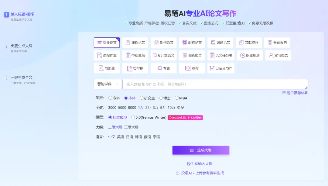 易笔AI作为一款专业的AI论文工具,其核心优势体现在对学术规范严谨性和内容生成高质量的深度融合。它并非简单的文本生成器,而是依托DeepSeek-R1学术加强模型与AI5.0技术构建的AI论文生成器,而且其操作简单,功能实用,是很多人入门AI写论文的首选。