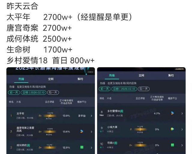 谁能想到啊,最好的寒假档,剧居然都播得没啥水花,扑得厉害!业内本来特看好的《太平年》《生命树》,结果都没起来。白鹿在优酷播的剧,竟然直接超过了杨紫在爱奇艺的剧——要知道优酷可是出了名的“天残平台”啊!这么一来,白鹿在90花里的地位更稳了。王楚然那部一番剧,虽说热度才2000多,但也超过了杨紫,总算有了拿得出手的实绩!而且她在剧里是真的美,古偶本来就该让年轻美女来演,观众才爱看嘛!看来95花正在慢慢崛起啦!