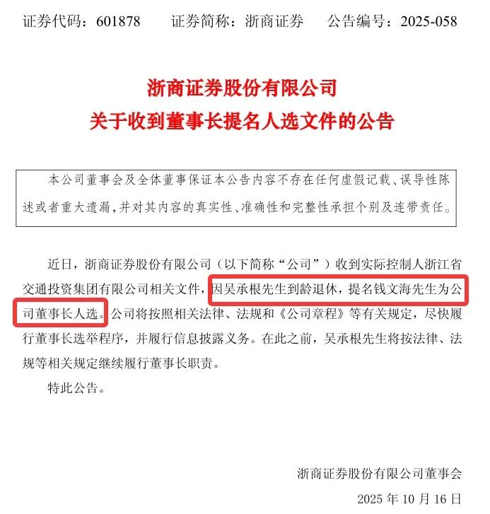 2025年10月,浙商证券公告,时任公司总裁钱文海正式履行董事长、法定代表人等职务,同时兼任总裁、代行财务负责人,至今已过去约4个月。