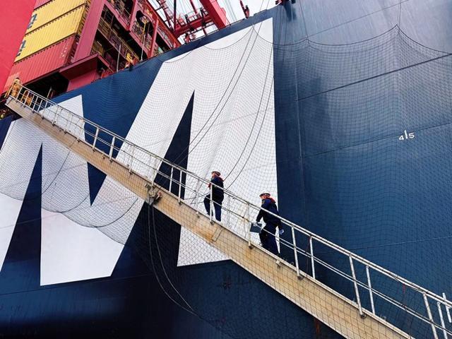 LNG加注船“海洋石油302”轮缓缓靠向集装箱船“地中海史黛丝”轮。吴梦凯摄