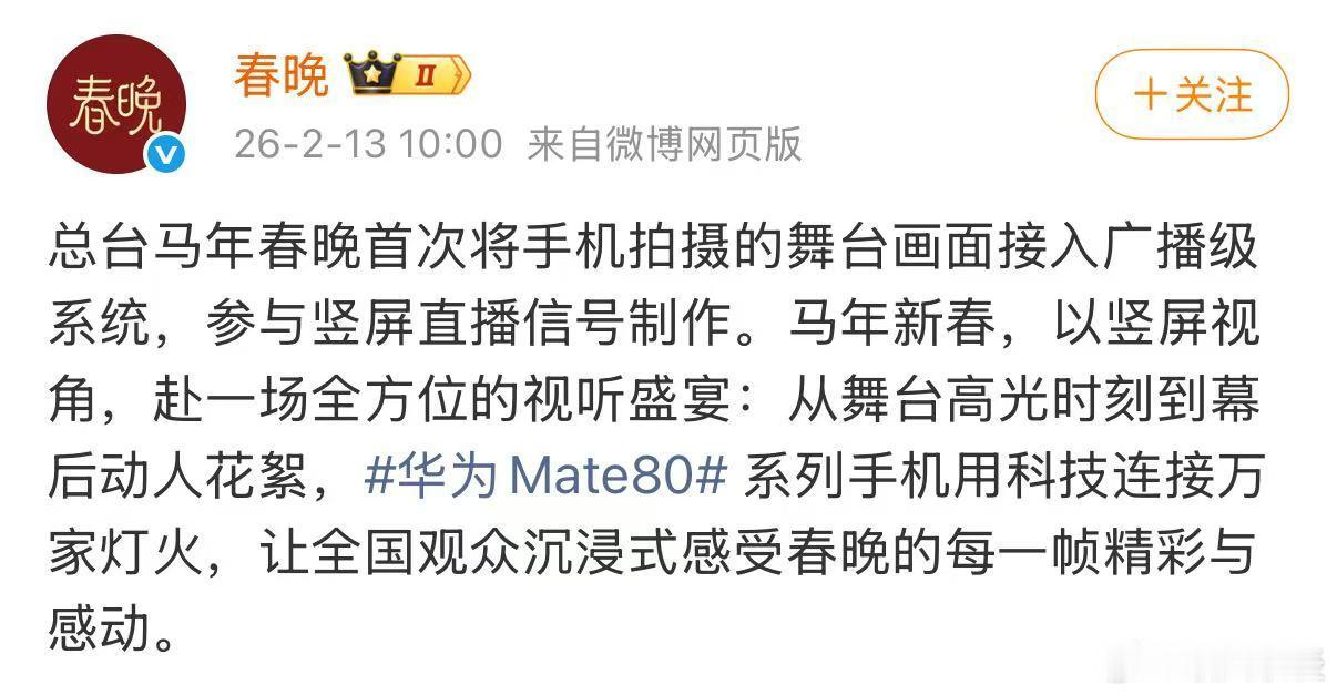 原来现在手机也能直播春晚了第一次见春晚用手机直播 今天广电圈和科技圈都被春晚的官宣刷屏了,马年春晚将首次启用手机作为竖屏直播的核心设备,直接接入广播级转播系统。这一创举打破了以往专业设备对直播的垄断,而从鸿蒙盛典的合作铺垫到此次的全面落地,也标志着手机厂商与央视的合作进入了全新阶段,手机的技术硬实力终于在国家级晚会上得到了最权威的认证。