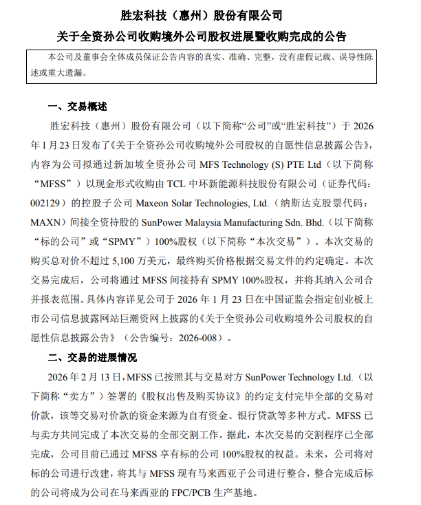 2月13日,胜宏科技(300476.SZ)公告,公司拟通过新加坡全资孙公司MFSS以现金形式收购由TCL中环新能源科技股份有限公司的控股子公司MaxeonSolarTechnologies,Ltd.间接全资持股的SPMY100%股权。