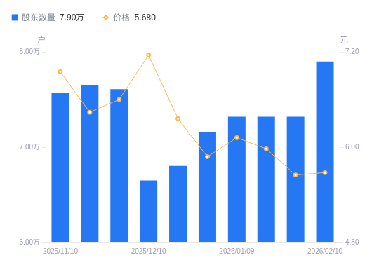 2月12日消息,数据显示,截至2026年2月10日,宝馨科技A股股东总户数为7.9万户,较上期(2026年1月31日)增加5798户,增幅7.92%。公司最新A股总股本为7.2亿股,其中流通A股5.54亿股,户均持有流通A股数量为7013.8股,较上期减少555.59股,降幅7.34%;户均持流通A股市值3.98万元,较上期减少2928.68元,降幅6.85%。