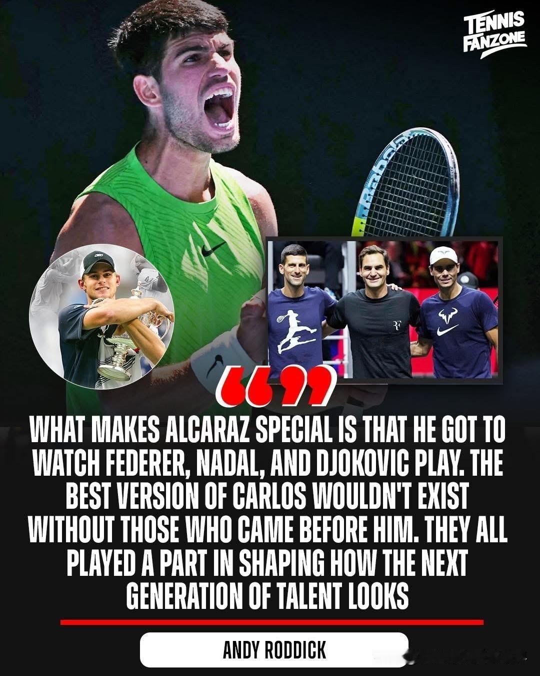 安迪·罗迪克认为之所以阿尔卡拉斯如此出色,是因为他有机会见证三巨头的比赛! 前美网冠军罗迪克说:“阿尔卡拉斯的特别之处在于他有机会观看费德勒、纳达尔和德约科维奇的比赛,如果没有前辈们的帮助,就不会有如今最好的卡洛斯。他们都为塑造下一代天才的形象做出了贡献。” 不得不说罗迪克确实说得有道理,不少人发现阿尔卡拉斯比赛的时候身上有三巨头的影子,无论是技术还是对比赛的态度,大家认为阿尔卡拉斯是三巨头的结合体吗?