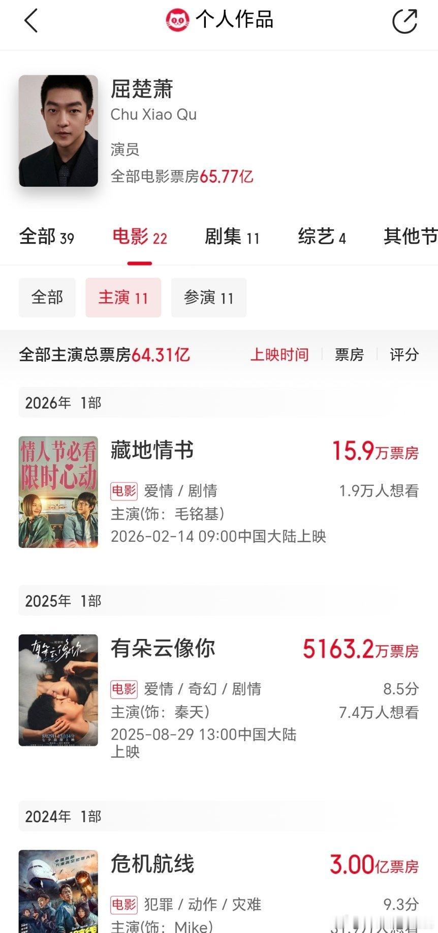 张万森下雪了❄️ 闪星的票房奇迹曾经让屈楚萧除流浪地球之外用另一种小成本题材证明了自己在爱情片的绝对统治地位。这以后的燃冬票房虽不理想但是演技得到碾压式肯定,90🥜里曾经有独属于自己赛道的优势…… 去年跟王子文的爱情片5000w+票房,没啥讨论度感觉接了好几部糖水爱情片就销声匿迹了。在类型片剧情片这种有一定演技支撑的赛道被同公司小蒋迅速超越,一下失去了核心竞争力。路线规划不好,痞帅坏小子赛道其实应该继续走下去,接几部剧刷脸也行,曝光太少了。