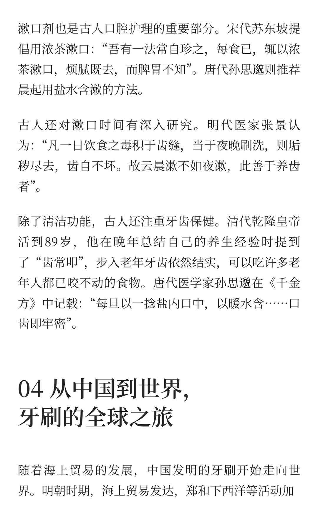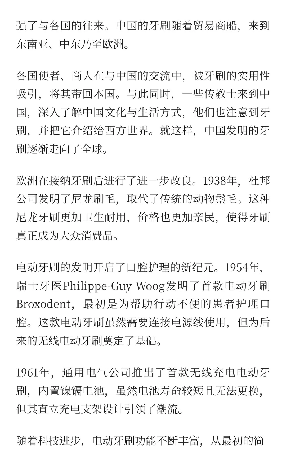 中国早在唐代就有洁牙工具,明代发明猪鬃毛牙刷,传入欧洲引发全球革命。现代电动牙刷结合科技,提升清洁效果,成为全球普及的日用品。