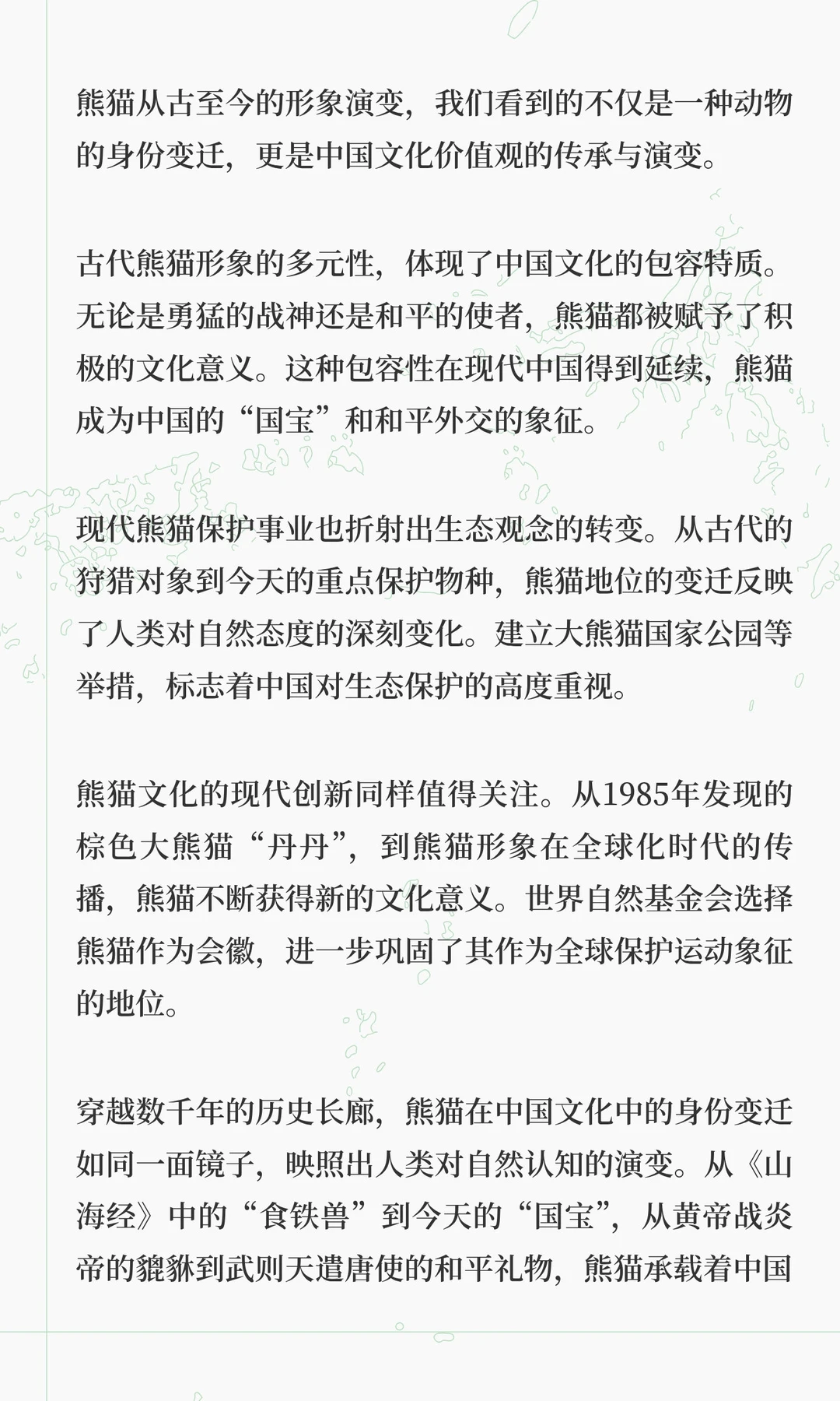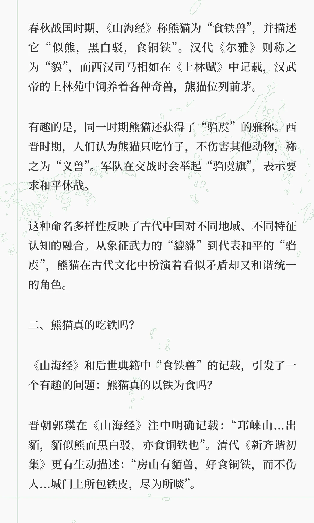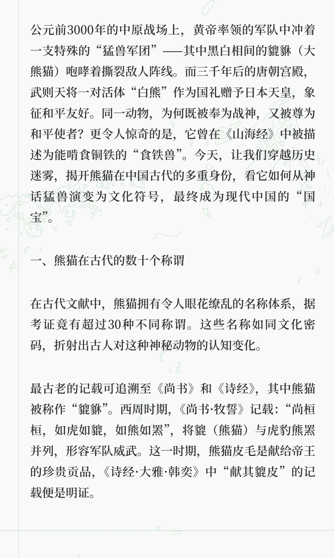 熊猫在古代文化中经历了从战神到和平使者的转变,拥有超过30种称谓,如貔貅、食铁兽、驺虞等。从《山海经》中的神话猛兽到现代“国宝”,熊猫象征着中国文化的包容与生态观念的演变。
