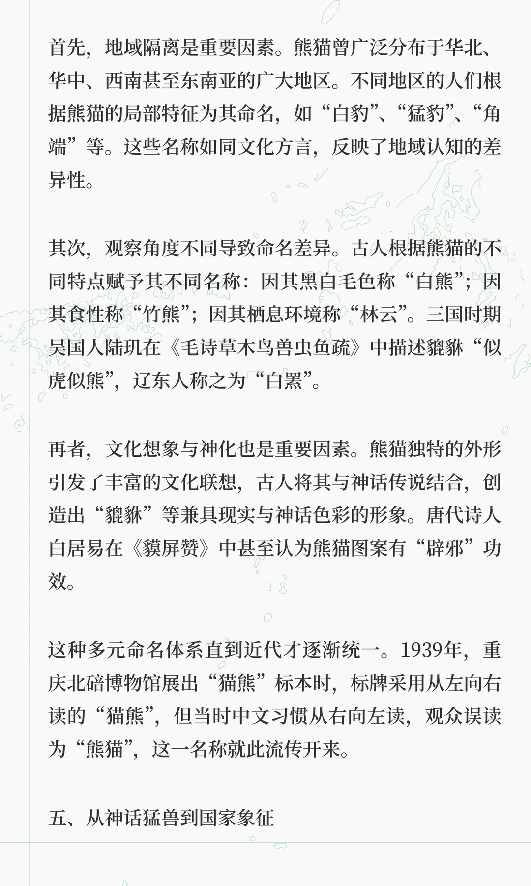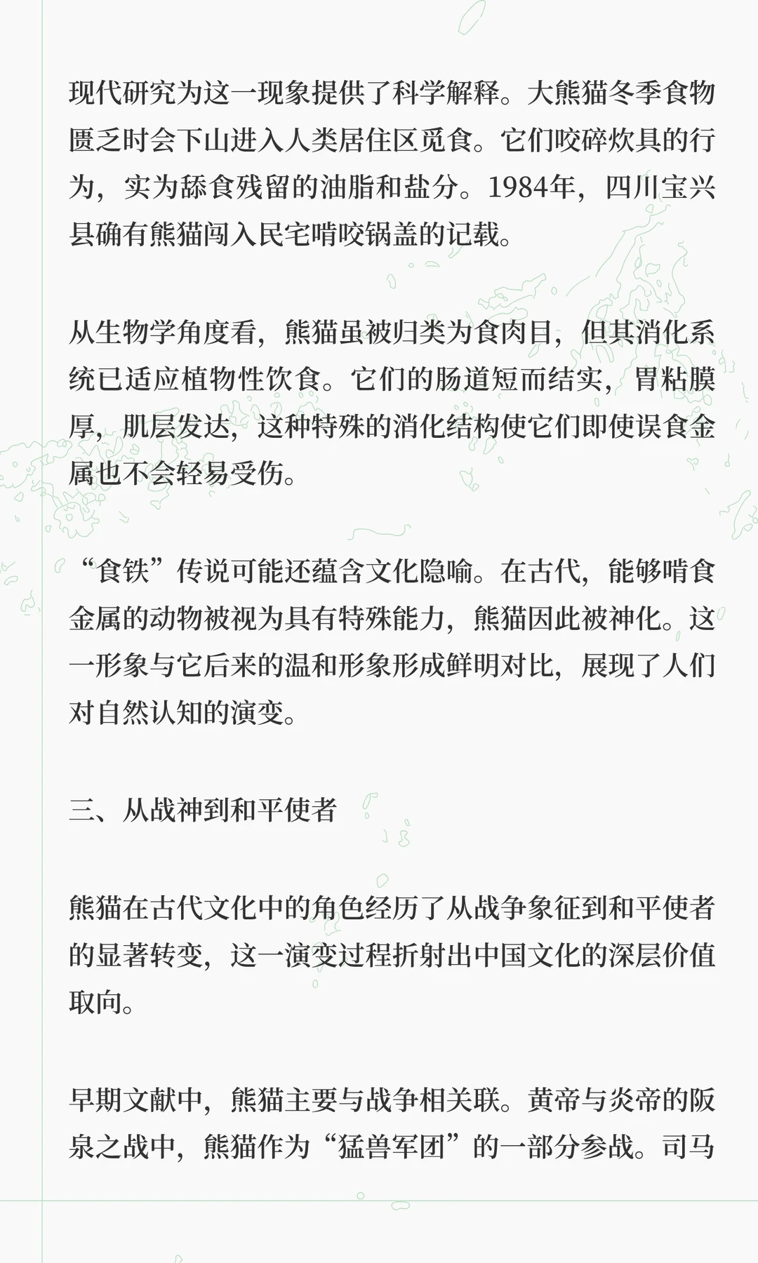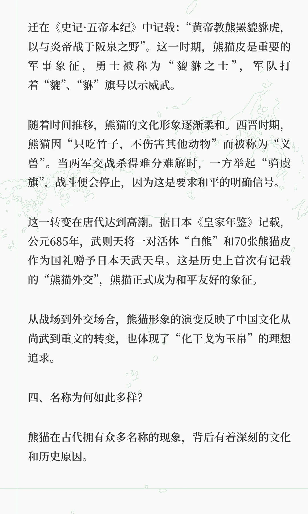 熊猫在古代文化中经历了从战神到和平使者的转变,拥有超过30种称谓,如貔貅、食铁兽、驺虞等。从《山海经》中的神话猛兽到现代“国宝”,熊猫象征着中国文化的包容与生态观念的演变。