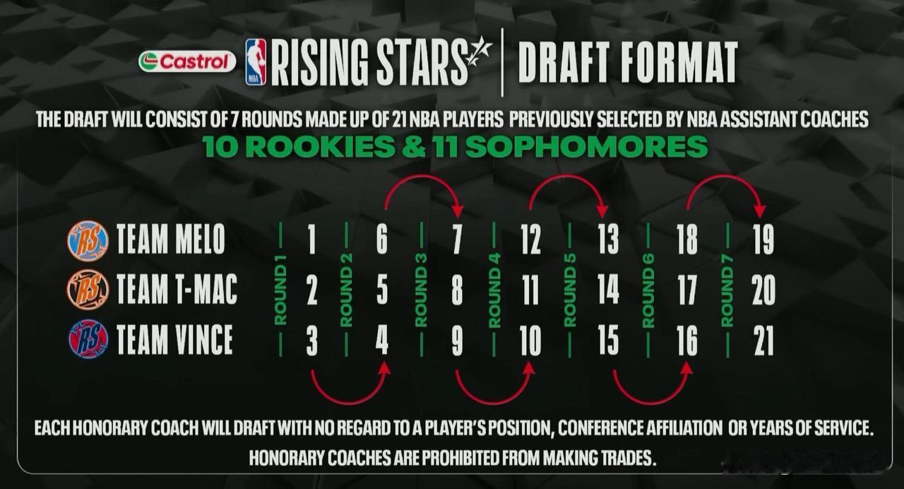 今天眨眼就是NBA全明星周末的开端了,有幸陪大家来看看今年的新秀挑战赛,而这也是今年全明星里时间最友好的比赛了[允悲] 今年新秀挑战赛还是大体沿用了从2022年开始的小型锦标赛制,由3支一二年级新人队伍,和一支发展联盟代表队共同组成参赛队伍。前三支队伍的主理人为本次全明星转播单位NBC的三位明星嘉宾安东尼、卡特和麦迪,发展联盟队伍则由本赛季担任NBC评论员的奥斯丁·里弗斯带队。 前三支队伍由NBA所有30支球队的助教们投票选出,和往年的区别是今年的新秀候选人们也不再有位置区分。在NBC电视转播中,安东尼、麦迪、卡特按照蛇形选秀的顺序,将21名球员分别组成了三支队伍,值得一提的是本次选择中的前三顺位弗拉格、克尼普尔、埃奇库姆全部来自2025届,一定程度上也体现了过去两届选秀的球员质量差距。 ⭐本届新秀挑战赛进入候选的21名球员,本赛季有20人都得分上双,唯一的例外是猛龙的科林·穆雷-博伊尔斯。但场均得分突破20分的球员也只有弗拉格一人,可惜弗拉格将因伤缺席比赛。 ⭐三支球队可以说各有特点,安东尼队即便在艾斯·贝利替换弗拉格后,依然是天赋最高的队伍,所有球员选秀顺位均在前10;麦迪队是射术最精湛的队伍,队内几乎所有球员都具备空间属性,尤其拥有克尼普尔、杰伦·泰森、卡姆·斯潘塞三位顶级投手;卡特队则拥有最出色的身高条件7名球员有5位身高超过两米。 ⭐所有21名球员中没有落选秀的身影出现,二轮秀有两人,均为2024年灰熊在二轮选中的球员,39顺位的杰伦·威尔斯和53顺位的卡姆·斯潘塞。 ⭐不少在NBA球队的队友将在新秀赛继续合作,比如奇才队特雷·约翰逊和卡灵顿、灰熊队的杰伦·威尔斯和塞德里克·考沃德、马刺队的斯蒂芬·卡斯尔和迪伦·哈珀。 ⭐康涅狄格大学2024年夺得全美冠军的五人先发中,其中四位卡斯尔、克林根、斯潘塞和特里斯滕·纽顿均入选了本届新秀赛,还在学校奋战的卡拉班留下了孤独的泪水。(顺便一提,2025届全美冠军佛罗里达,外线三驾马车出场更多的克莱顿和理查德均未入选,反而是机会最少的阿莱贾·马丁走了个G联赛名额)。 ⭐艾斯·贝利替换弗拉格后,他和迪伦·哈珀这队罗格斯大学的双子星得到了再次成为队友并肩作战的机会。 ⭐比赛对阵抽签结果已经出炉,安东尼队首战对阵G联赛,麦迪卡特表兄弟对决,这也就意味着杨瀚森将和克林根上来就直接交锋。 ⭐罗恩·哈珀在本赛季G联赛表现出色,得到了进入发展联盟选拔队的机会,于是老哈珀的两个儿子也将在本届比赛面对面交锋,此前在本赛季NBA中他们还没有机会交手。 ⭐绝大部分NBA球员最多只有两次参与新秀挑战赛的机会,比如本届新秀赛只有8人参与了去年的比赛,其中还包括去年走了G联赛名额的里德·谢泼德。但还是有一些球员打破了特例,比如布泽利斯今年将第三次参赛,而麦克·麦克朗在成为扣篮大赛最高的山同时,几乎也成为了新秀挑战赛最长的河,他过去三年都入选了G联赛选拔队,本赛季原本落选了最初名单,但因为马刺双向球员大卫·琼斯-加西亚的伤缺,在G联赛场均25.8分的麦克朗被宣布入替,但在踏上第四次新秀挑战赛之旅前,麦克朗本人也宣告伤退,热火队双向球员,G联场均26.2分8.9助攻的贾米尔·杨最终得到了这个替换资格。 好了,祝大家到时候观赛愉快。当然更重要的是祝大家今天过得愉快。