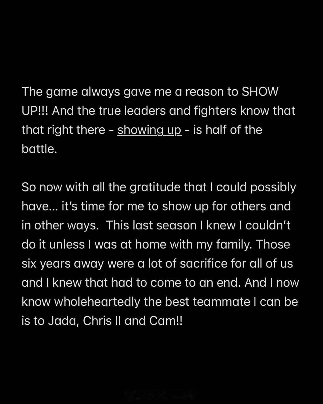 带着这份感激,现在轮到我去为他人、以另一种方式“到场”了。上个赛季我意识到,如果不能陪在家人身边,我无法全身心地投入比赛。那六年远走他乡的日子,对我们全家来说都是巨大的牺牲,是时候结束这种状态了。现在我全心全意地明白,我最重要的队友,是 Jada、Chris II 和 Cam。