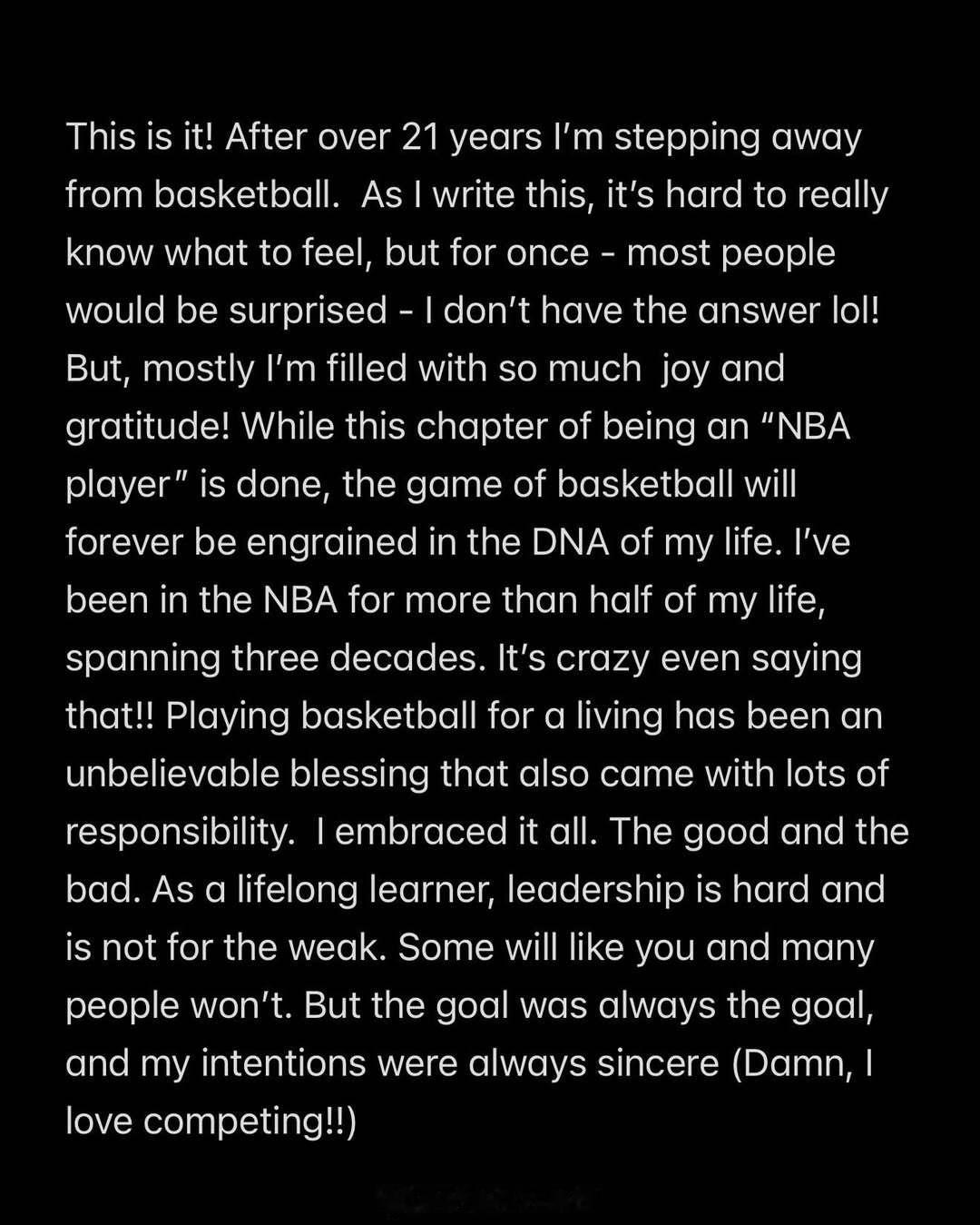 终于,我走到了这一刻。在篮球场上征战了21年之后,我决定正式退役。写下这些文字时,我的内心五味杂陈,甚至连我自己——这个在大多数情况下总能掌控局面的人——此刻也有些不知所措。