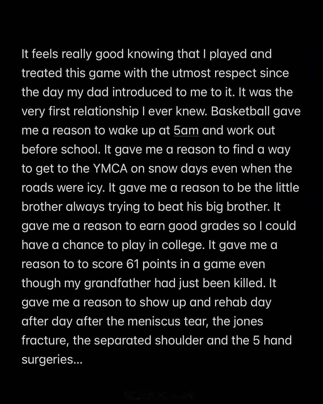 但占据我内心更多的,是满溢的喜悦与感激。虽然“NBA球员”这个身份已成往事,但篮球早已刻进我的骨血。我生命中超过一半的时光、跨越整整三个十年都在NBA度过,现在回想起来,这简直不可思议。