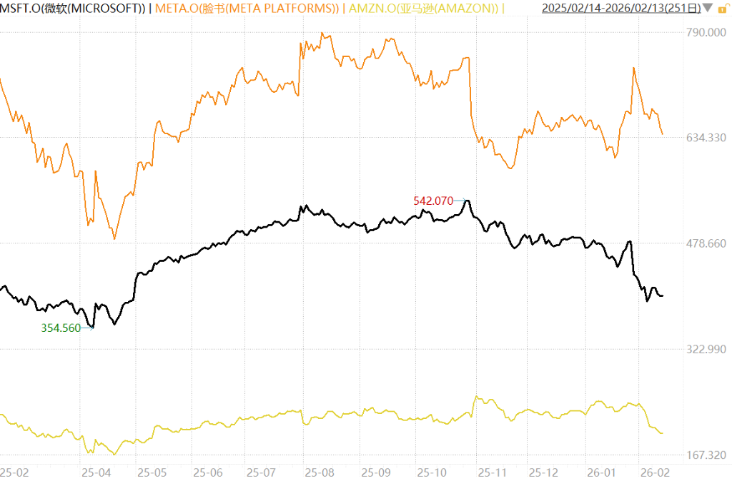 亚马逊、微软和Meta股价遭受更大冲击,因为投资者对这些公司AI支出能否带来足够投资回报信心不足。对于亚马逊而言,资本支出水平的提高可能导致其今年自由现金流转为负值,这意味着公司需要开始进入债务市场筹集更多资本。