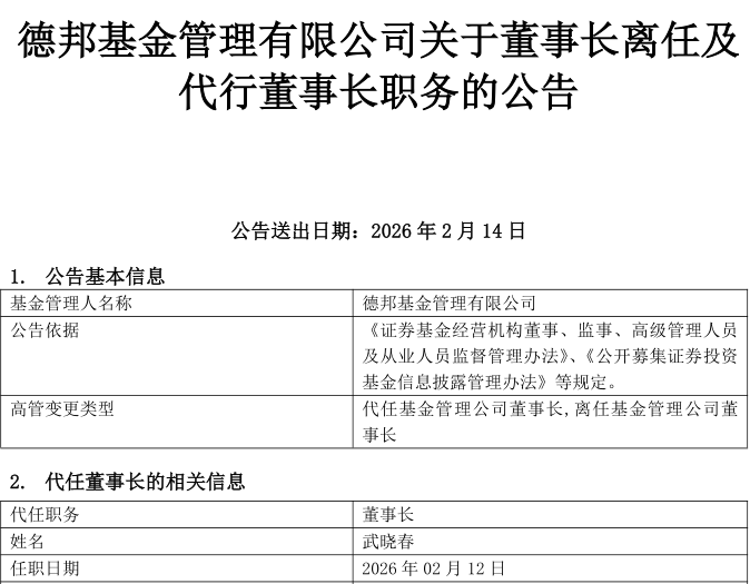 2月14日,德邦基金发布人事变更公告,宣布公司董事长任职调整事宜:经董事会审议通过,左畅不再担任公司董事长职务,武晓春将代行公司董事长职责。