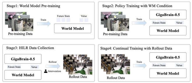 在GigaBrain-0.5M*的研发中,极佳视界提出基于世界模型的强化学习范式,并采用迭代式四阶段闭环训练流程: