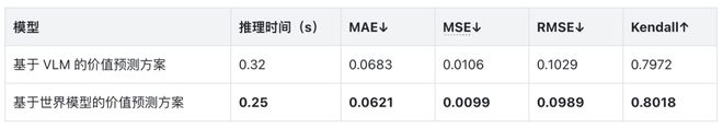 实验结果表明,基于世界模型的价值预测方案在执行效率与预测精度上,均优于π*0.6提出的VLM方案。