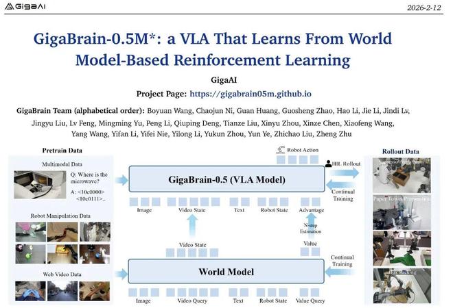 [新智元导读]极佳视界具身大模型GigaBrain-0.5M*,以世界模型预测未来状态驱动机器人决策,并实现了持续自我进化,超越π*0.6实现SOTA!该模型在叠衣、冲咖啡、折纸盒等真实任务中实现接近100%成功率;相比主流基线方法任务成功率提升近30%;基于超万小时数据训练,其中六成由自研世界模型高保真合成。