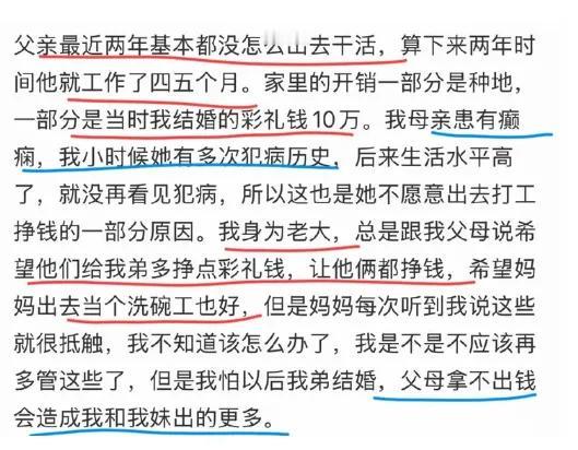 看完那个让癫痫妈妈打工挣彩礼的帖子,真的是后背发凉。这已经不再是家庭矛盾,彩礼这把刀,正在一刀刀割裂亲情。 博主一家靠她10万彩礼过日子,父母摆烂不工作,弟弟的彩礼迟早压到姐姐头上。她想了一招,让患又癫痫的,妈妈出去挣钱给弟弟攒彩礼。网友骂她没良心,可扶弟魔的咒早晚会降临到她身上。这不是个例,是无数中国家庭的缩影。多少父母为凑彩礼卖房借债,剥削闺女。可能最后仍是婚后小两口天天为钱吵架,最后人财两空的一地鸡毛。 彩礼从“礼仪”异化成“交易”,从祝福变成枷锁。女方家庭觉得是“保障”,男方家庭觉得是“剥削”,婚姻还没开始,就算计得明明白白。而那些嫁出去的姑娘,泼出去的水,就算不想扶弟的...可能连娘家都回不去。 婚姻不该让父母为彩礼折腰,更别让姐妹为弟弟买单。婚姻的本质是爱与责任,不是明码标价的买卖。当彩礼回归“礼”的本心,家庭才能找回温度。