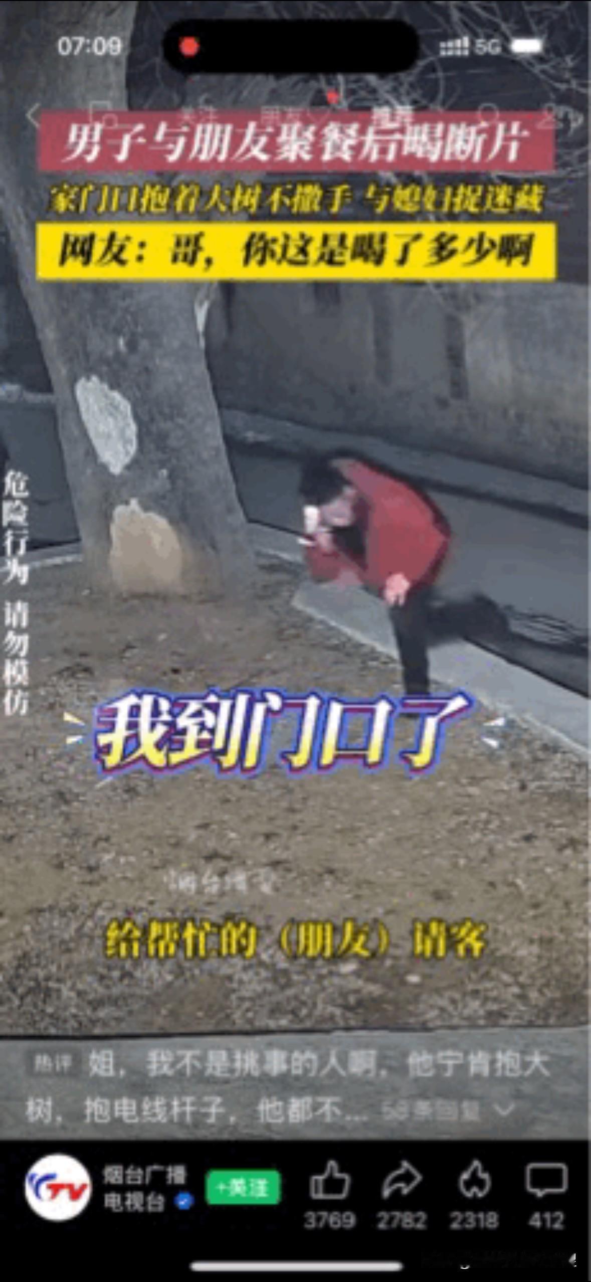 笑不活了!春节期间,一男子过年回家。由于他回家的比较早,帮村里的老友帮了一些忙,晚上在一起吃饭时一时兴起喝得有点多,朋友担心他安全,特意将他送到了家门口,谁知接下来的一幕,让赶来接他的老婆哭笑不得。 这天,朋友为了感谢他帮忙,就在家摆了一桌饭,请了几个要好的朋友一起吃饭喝酒。饭桌上众人推杯换盏,聊得不亦乐乎,男子也趁着兴致多喝了几杯,不知不觉就喝到酩酊大醉,彻底断了片。 聚餐结束后,放心不下的朋友一路将男子送到自家门口,男子到了家门口的路边,就挥手让朋友们走了。 视频显示,男子到了路边,掏出手机给老婆打了电话,说自己回来了,让老婆出来接自己。 男子家门口有一棵大树,树干粗的几个人也抱不过来,大树的四周用砌成了一个台阶,男子准备走上去,却四肢无力,只能爬了上去。 爬上台阶的男子,一边打着电话,一边正寻找着什么。突然他踉踉跄跄地向门口的那棵树走过去,双手一合拢,准备抱住树身。但由于醉酒后意识控制不住身体的力量,他撞到了树上,向后一摔,摔了个四仰八叉。 男子摔倒后,又爬了起来,继续去抱树,这次他成功地趴在了树上。 老婆从家里出来后发现男子趴在树上,便上前询问他在做什么,男子听到熟悉的声音,迷迷糊糊地松开大树,脚步不稳地准备朝老婆走去。 可让人意想不到的是,走了没两步,男子就又回到树边,还绕着树和老婆玩起了捉迷藏。老婆在左,他就在右,一会回头看下老婆,一会又向前绕过去,不时地做个鬼脸,老婆看着他醉醺醺的样子,真是无奈又好笑。 第二天男子酒醒后,老婆告诉他昨晚的荒唐事,他全然不记得,于是他翻看监控看到自己抱树抱柱、躲猫猫的样子,自己也觉得又尴尬又好玩,便顺手把视频发到了网上,瞬间引发网友们的爆笑热议。 有网友说,这还算正常的,我有次喝醉了就在马路边睡了一个晚上,第二天早上还是晨起锻炼的大妈把我叫醒的。 还有网友打趣追问:“咱就是说,放着老婆不抱,偏偏抱着树干柱子,这到底是啥意思?” 更有网友表示,过年和老友相聚开心喝点酒无可厚非,但不能过量,如果出现什么危险,谁也担不起。 取材网络,侵删,个人观点,仅供参考。