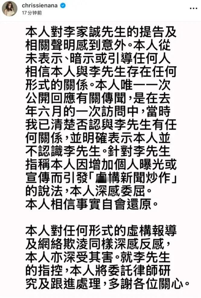 纠缠十年终爆发!李家诚正式起诉周秀娜,双方回应完全对立 2月13日,香港豪门与娱乐圈突发重磅风波,恒基地产主席李家诚入禀香港高等法院,以诽谤及骚扰为由,控告艺人周秀娜及5个社交平台频道,长达近十年的不实传闻终于迎来法律层面的正面交锋。 李家诚在个人声明中态度强硬,直指周秀娜是多年虚假绯闻的策划源头,动机是为电影宣传、提升个人曝光度。他郑重澄清,双方完全不认识、无任何交集,沉默忍让近十年,却让谣言愈演愈烈,不仅困扰家人生活,更严重损害家族声誉,此次起诉只为捍卫名誉,同时抵制网络欺凌与恶意造谣。 事件迅速发酵,当晚周秀娜便公开回应,直言对起诉感到意外又委屈。她强调从未暗示或捏造与李家诚的关系,去年6月受访时已明确否认传闻、表态互不相识。对于“借绯闻炒作”的指控,她坚决反驳,称自己同样是网络谣言的受害者,反感一切虚构报道,并已委托律师跟进,相信事实会还原真相。 一方是忍无可忍、诉诸法律的豪门富商,一方是委屈否认、静待澄清的艺人,这场“互不认识”却对簿公堂的闹剧,如今双方均交由法律处理,后续庭审与证据披露,或将揭开这场长期传闻的真相。 被传绯闻近十年,你更相信李家诚,还是周秀娜? 八卦手册 周秀娜