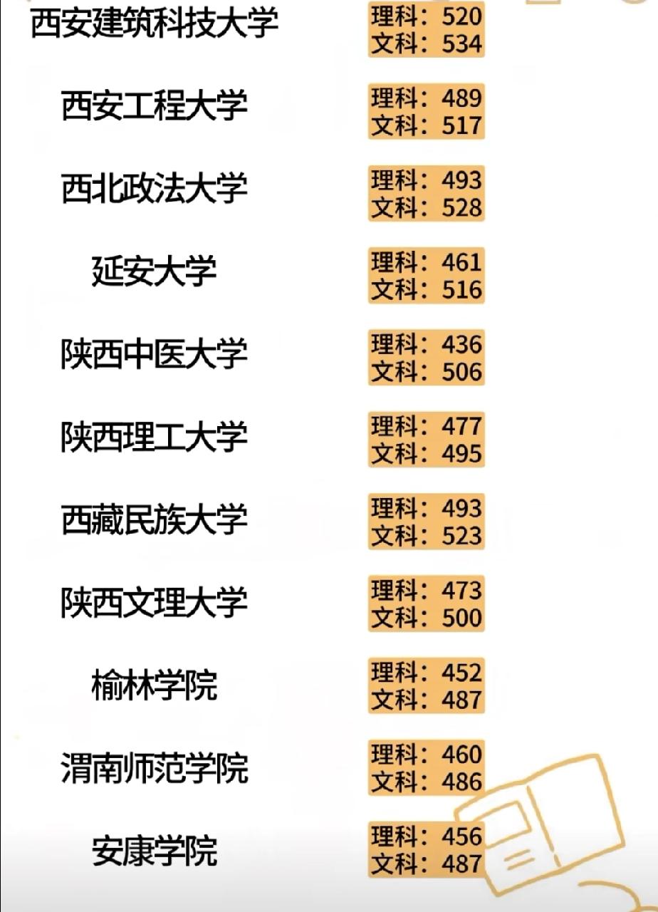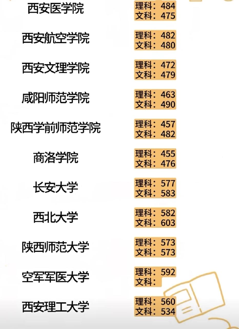 2025年陕西高校高考分数线出炉!顶尖院校门槛再创新高 2025年陕西高考录取分数线已公布,从各高校的投档线来看,省内高校的录取格局依然清晰,顶尖院校的竞争尤为激烈。 在第一梯队,西安交通大学以理科648分、文科634分的分数线稳居榜首,西北工业大学紧随其后,理科641分、文科624分,展现了“双一流”高校的强劲实力。西安电子科技大学理科626分、文科591分,也保持了电子信息领域的高门槛。 第二梯队的高校中,西北大学、长安大学、陕西师范大学等“双一流”院校表现亮眼。西北大学理科582分、文科603分,长安大学理科577分、文科583分,陕西师范大学文理科均为573分,体现了综合类和师范类院校的吸引力。 普通本科院校的分数线则呈现出明显的梯度。西安建筑科技大学理科520分、文科534分;西安理工大学理科560分、文科534分;西安石油大学理科509分、文科491分。而像陕西中医大学(理科436分、文科506分)、榆林学院(理科452分、文科487分)等院校,则为更多考生提供了升学机会。 值得注意的是,空军军医大学理科分数线高达592分,文科暂无数据,体现了军事院校的特殊吸引力和严格选拔标准。西藏民族大学在陕招生的理科分数线为493分、文科523分,也展现了其在民族高等教育领域的影响力。 你的分数能上哪所大学?对照这份榜单,看看自己的目标院校是否在列!