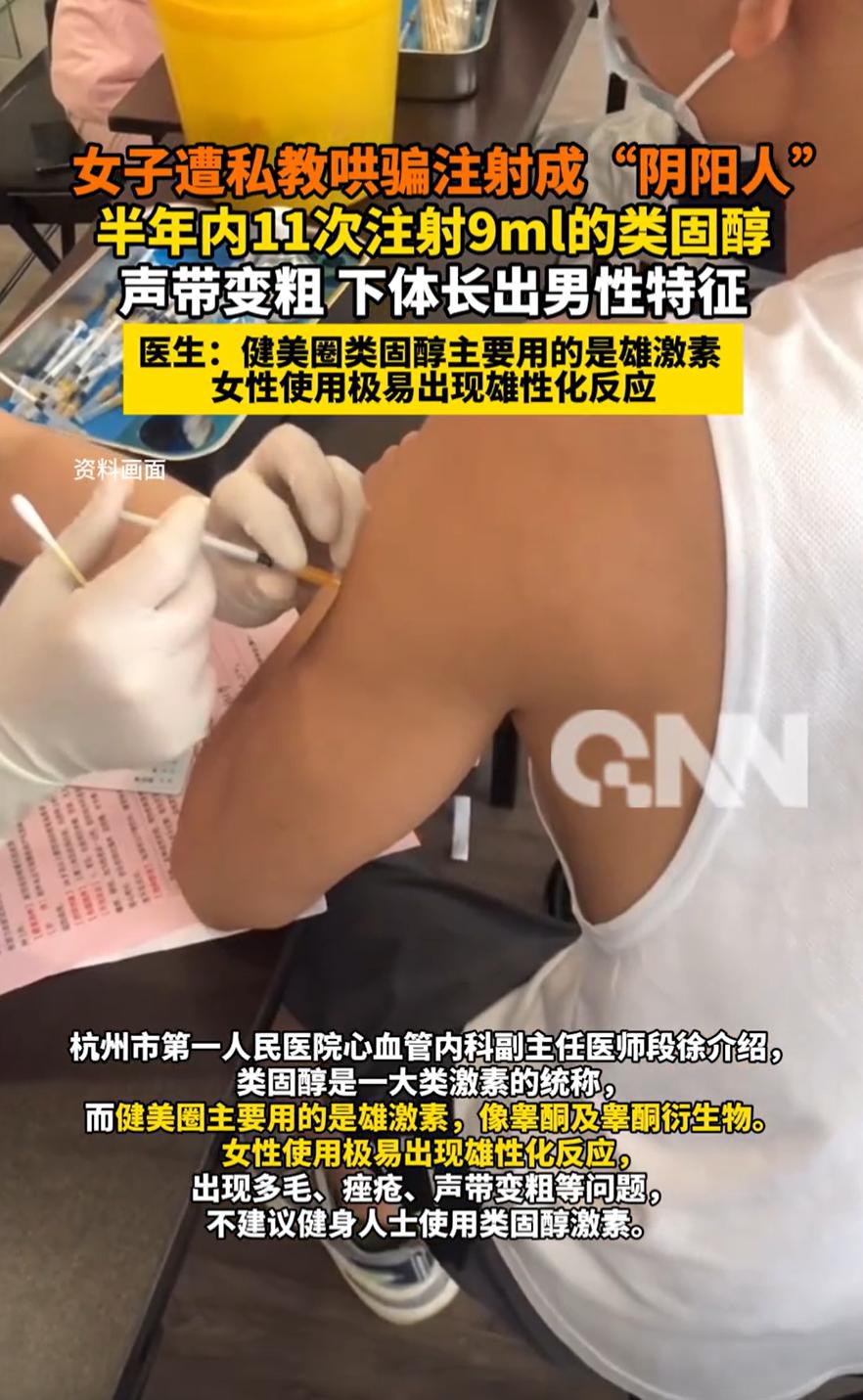“太缺德了!”浙江杭州,女子去健身房健身,为了健身效果更好还找了名私教,万万没想到,私教哄骗她注射类固酮,打了11次后,女子突然发现自己雄性激素飙升,不仅长出喉结,下体还长出类似男性特征的“肉芽”,医生告诉她身体雄性化,女子瞬间崩溃 女子称,这个教练平时看着挺热心的,一来二去就跟她混熟了。有一天,教练神神秘秘地跟她说,想效果来得更快,肌肉线条更漂亮,有一种好东西可以试试 女子起初肯定是犹豫的,毕竟往身体里打东西,换谁都得掂量掂量。但教练那一套套专业说辞,加上那种你信我就没错的自信,还是让她动摇了 她心想,人家是专业的,还能害自己不成?也是为了跟教练搞好关系,她就糊里糊涂地答应了 第一次注射完,好像也没什么特别的感觉,身体没啥反应,精神头也挺好。姑娘心里的石头落了地,觉得可能就是教练的一种特殊方法吧。有了第一次,就有第二次,第三次,前前后后一共打了十一次。每次打完,教练都告诉她没事,效果会慢慢显现,她也就没再多想 可慢慢地,不对劲的事儿来了。她开始察觉到自己身体出现了些奇怪的变化。起初是脸上的汗毛好像重了点,她以为是内分泌紊乱,没太往心里去 但后来,一些她做梦都想不到的状况出现了。有天照镜子,她惊恐地发现自己脖子上好像鼓出了一块,像是喉结 当她意识到问题的严重性时,她立刻想去看医生,想要停止这种变化。然而,教练得知她的打算后却开始阻止她,这时她才明白自己陷入了什么样的境地 说实话,这种私教行为的恶劣程度不言而喻。健身本应该是为了让人更健康、更自信,但却有人把自己的利益建立在他人健康的基础上。私教作为一个专业的职务,应该明确自己的责任和义务,不仅要帮助别人更好地锻炼,还要保护他们的身体健康 注射类固醇这种行为本身就充满了风险,而私教为了快速见效,竟然不顾女子的健康,选择了这样的“捷径” 这事得曝光也给所有人提了个醒。在关乎自己身体和健康的事情上,任何从别人嘴里说出来的好东西,尤其是不明不白的药物,都必须打起十二分的精神。永远不要把对自己的决定权,轻易交到别人手里。有时候,一次轻信,代价就是一辈子都还不清的噩梦