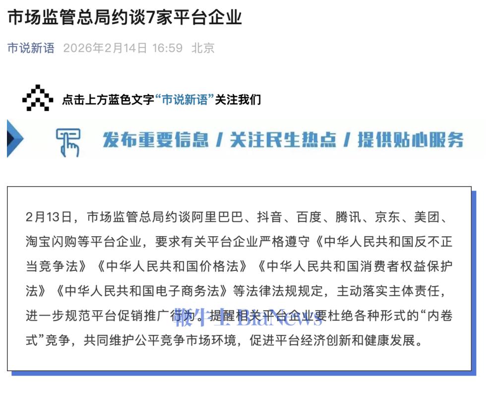 2月14日,据“市说新语”微信公号消息,2月13日,市场监管总局约谈阿里巴巴、抖音、百度、腾讯、京东、美团、淘宝闪购等平台企业。