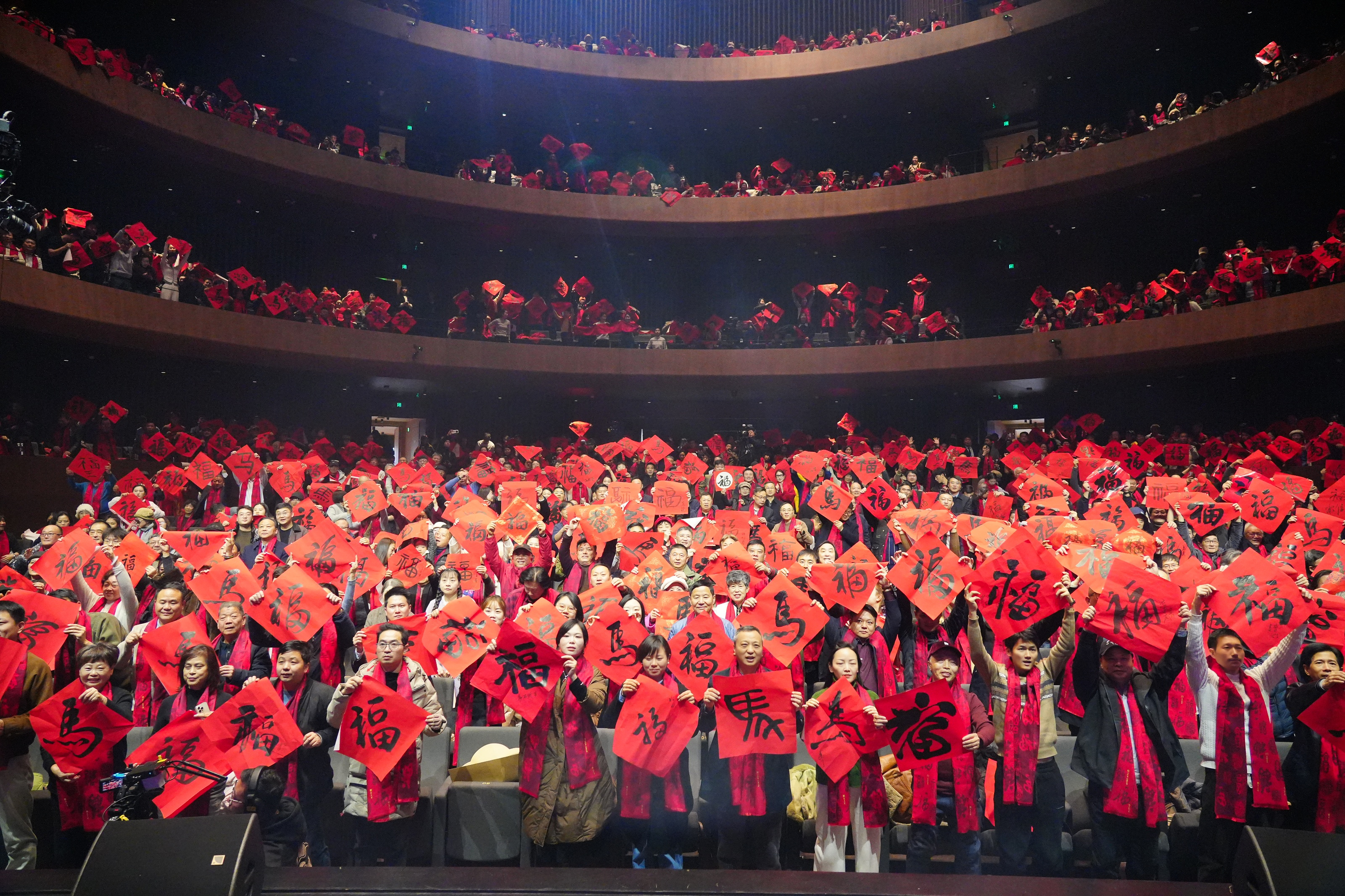 随之而来的“全场送福”将气氛再次推向高潮。在主持人的带领下,千余位陶瓷艺术家、各界嘉宾与观众共同举起手中的“福”字、“马”字——这些字样融汇篆、隶、楷、草不同书风,或浑厚或飘逸,顷刻间连缀成一片温暖跃动、文墨交融的红色海洋。伴随着“马上有福”的齐声祝愿响彻全场,新春的祝福与文化的温情深深传递到每个人心中。