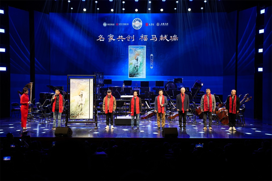 在充满年味的“送福”环节,中国陶瓷艺术大师吴能,中国陶瓷设计艺术大师高峰,中国陶瓷艺术大师况坚,中国工艺美术大师陈烈汉,中国陶瓷艺术大师陈敏,中国陶瓷艺术大师吴天麟,景德镇陶瓷大学教授张景辉,中国工艺美术大师傅长敏八位陶瓷艺术家集体创作的《一马当先》瓷板画被隆重推上舞台。该作品丰富的色彩背景、巍峨的山峦,映衬着骏马奔腾、一往无前的精神,充分体现了中华民族自强不息的豪迈气概,寄托着对新年龙马精神、一马当先的美好期盼。