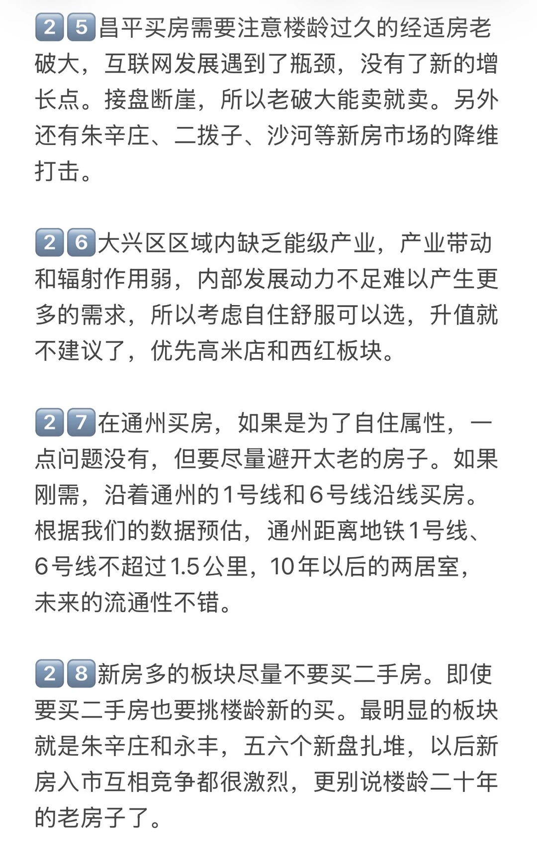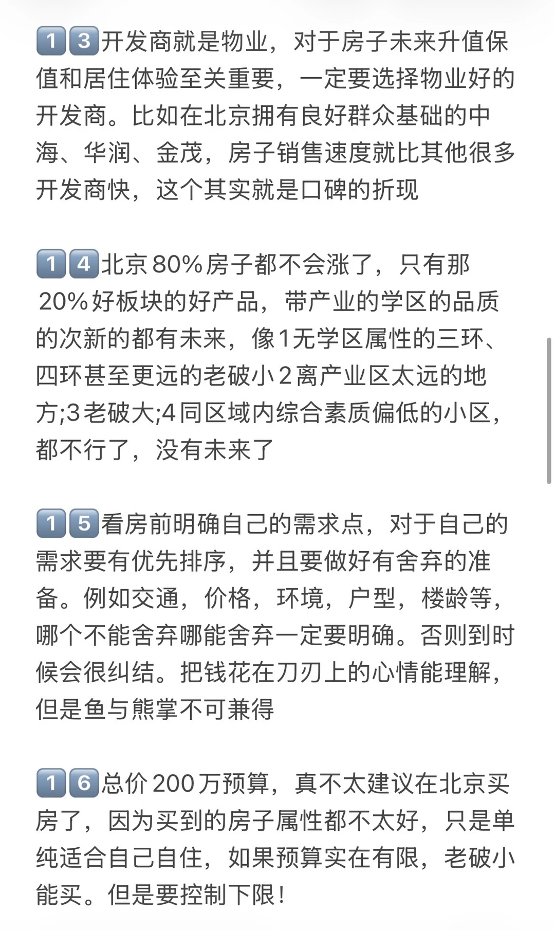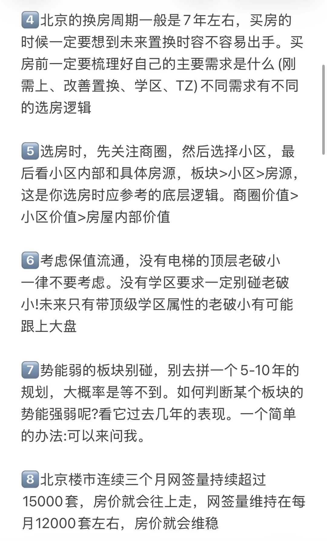 1️⃣北京买房要关注地铁规划,一定要在意地铁,通勤方便很重要!刚需买房首选的通勤方式就是地铁,地铁是必需的,北京是TOD式发展的模式,交通引领城市。地铁开通的前一天和地铁开通的第二天,立马是两个价格 2️⃣三居优于两居优于一居,从房子的流动性而言,同样预算下三居两居比一居更受欢迎!居室排名原则:三居>两居>四居>一居>五居,这个原则下,尽量上两三居,小区的涨幅预期,优先于居室。 3️⃣朝向排名大体上是:南北、全南、东南、南、东、东、、北。一般来说全南的房子比东西的房子卖得好一些,朝北朝西的房子流动性不行,住着也不会很舒服,都不太合适 4️⃣北京的换房周期一般是7年左右,买房的时候一定要想到未来置换时容不容易出手。买房前一定要梳理好自己的主要需求是什么(刚需上、改善置换、学区、TZ)不同需求有不同的选房逻辑 5️⃣选房时,先关注商圈,然后选择小区,最后看小区内部和具体房源,板块>小区>房源,这是你选房时应参考的底层逻辑。商圈价值>小区价值>房屋内部价值 6️⃣考虑保值流通,没有电梯的顶层老破小一律不要考虑。没有学区要求一定别碰老破小!未来只有带顶级学区属性的老破小有可能跟上大盘 7️⃣左滑图片,查看更多